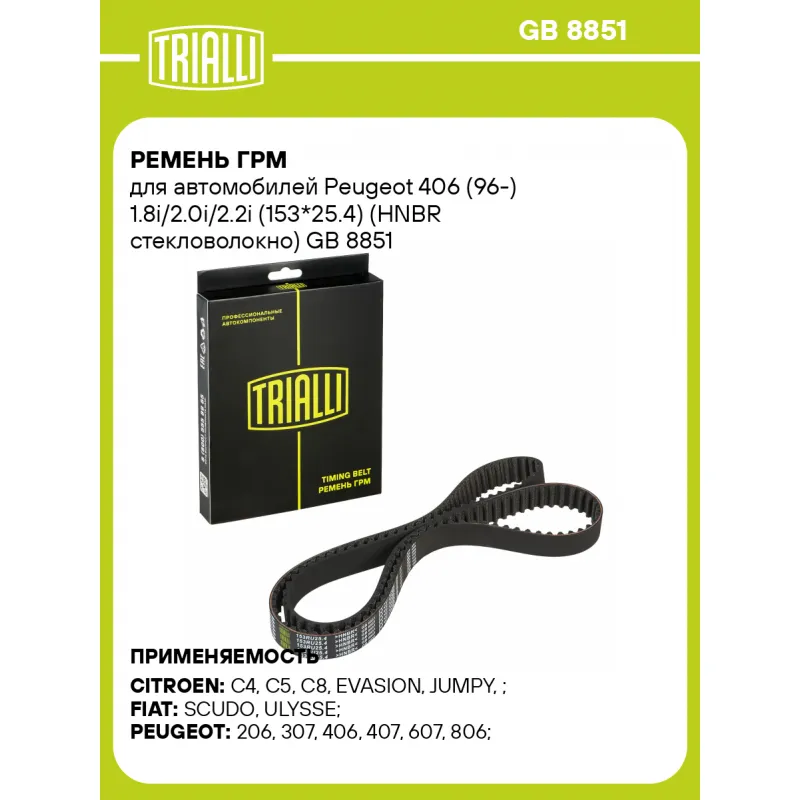 Ремень ГРМ для автомобилей Peugeot 406 (96-) 1.8i/2.0i/2.2i (153*25.4) (HNBR стекловолокно) Характеристики: Артикул: GB 8851 OEM номера: 0816.F4, 0816.C2, 0816.A1, 96372405, 9637240580, 96476100, 9647610080, 9 464 464 980, 9400816190, 9637053980 Материал: HNBR Особенности конструкции:: 153RU25.4 Ширина, мм: 25,4 Количество ребер: 153 Длина, мм.: 1457 Гарантийный срок: 2 года/60 000 км. Количество на автомобиль: 1 Товарная линейка: BLACK Комплектация: Ремень ГРМ - 1 шт Гарантия: от 1 года.