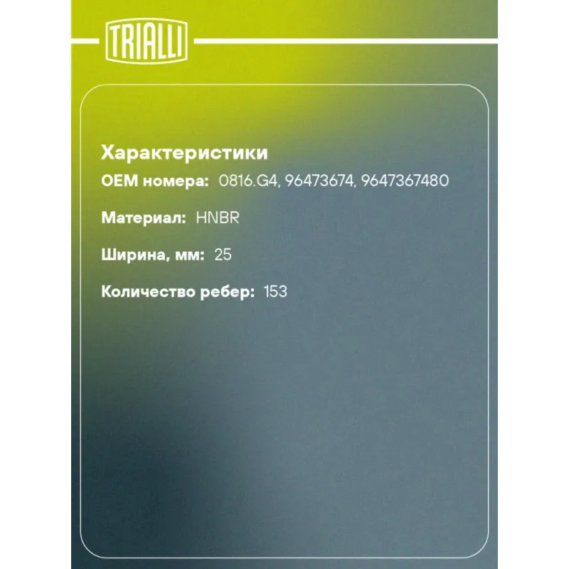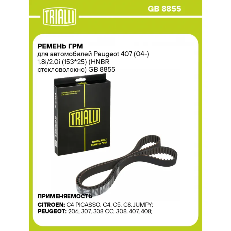 Ремень ГРМ для автомобилей Peugeot 407 (04-) 1.8i/2.0i (153*25) (HNBR стекловолокно) Характеристики: Артикул: GB 8855 OEM номера: 0816.G4, 96473674, 9647367480 Материал: HNBR Особенности конструкции:: 153RU25.4 Ширина, мм: 25 Количество ребер: 153 Длина, мм.: 1457 Гарантийный срок: 2 года/60 000 км. Количество на автомобиль: 1 Т... Читать полностью →