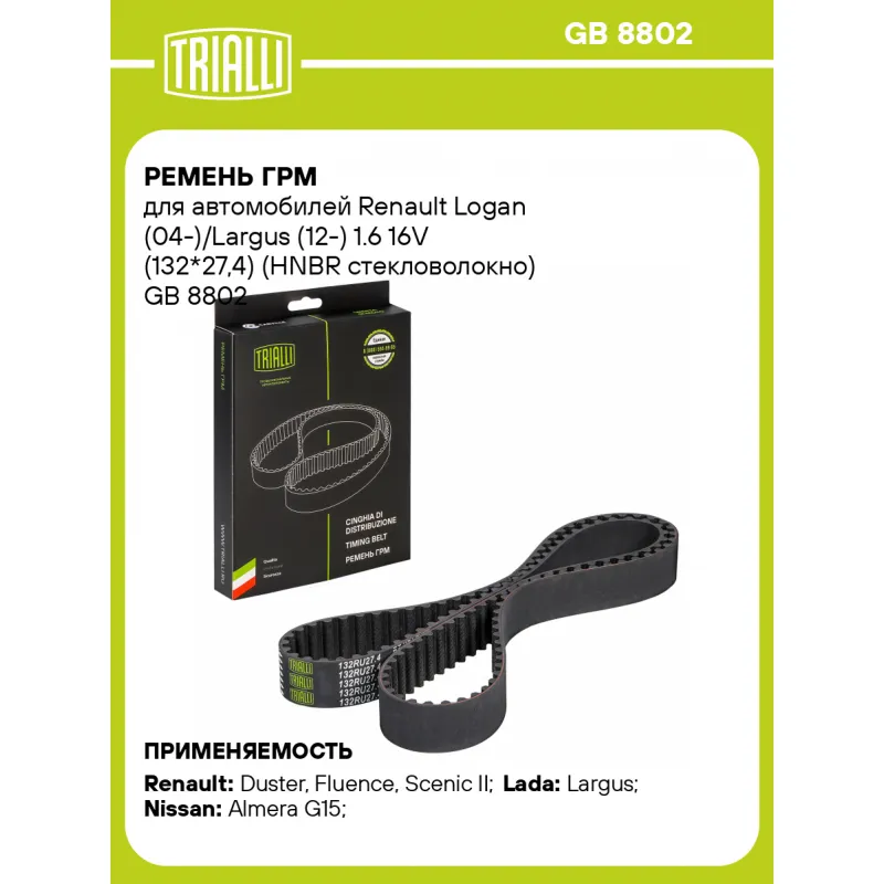 Ремень ГРМ для автомобилей Renault Logan (04-)/Largus (12-) 1.6 16V (132*27,4) (HNBR стекловолокно) Характеристики: Артикул: GB 8802 OEM номера: 1680600QA1, 1680600QA7, 1680600QAA, 16806-00Q0M, 8200897100, 7700101248, 7700108412, 7700113558, 8200142350, 8200208422, 8200537023, 8200537026, 8200897097, 8201069699 Материал: HNBR Сопутствующие товары:: CM 0903, CM 0905, GD 7702, GT 7701 Особенности конструкции:: 132RU27 Ширина, мм: 27,4 Количество ребер: 132 Длина, мм.: 1257,30 Гарантийный срок: 1 год/30 000 км. Количество на автомобиль: 1 Товарная линейка: BLACK Подходит для авто: Renault Duster (10-), Fluence (10-), Scenic II (04-), Scenic III (09-), Kangoo (97-), Laguna I (94-), Laguna II (01-), Logan (04-), Sandero I (09-), Twingo (07-), Clio II (98-), Clio III (05-), Duster (10-), Kangoo II (07-), Laguna II (02-), Laguna III (07-), Logan (04-), Logan (08-), Megane I (95-), Megane I (95-), Megane II (02-), Megane III (08-), Sandero II (14-), Scenic I (96-), Symbol II (08-) ВАЗ Largus (12-) Nissan Almera G15 (12-) Для проверки применяемости отправьте VIN автомобиля через вкладку "Есть вопросы о товаре?" Комплектация: Ремень ГРМ - 1 шт Гарантия: от 1 года.