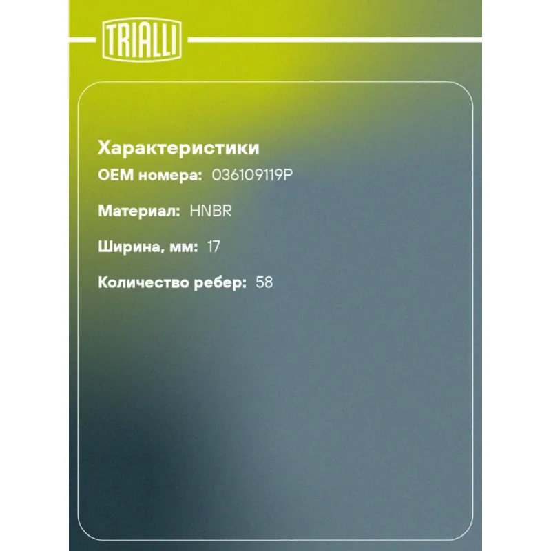 Ремень ГРМ для автомобилей Skoda Fabia (97-)/VW Polo (99-) 1.4i/1.6i (58*17) (HNBR стекловолокно) Характеристики: Артикул: GB 8926 OEM номера: 036109119P Материал: HNBR Особенности конструкции:: 58S8M17 Ширина, мм: 17 Количество ребер: 58 Длина, мм.: 464 Гарантийный срок: 2 года/60 000 км. Количество на автомобиль: 1 Товарная ли... Читать полностью →