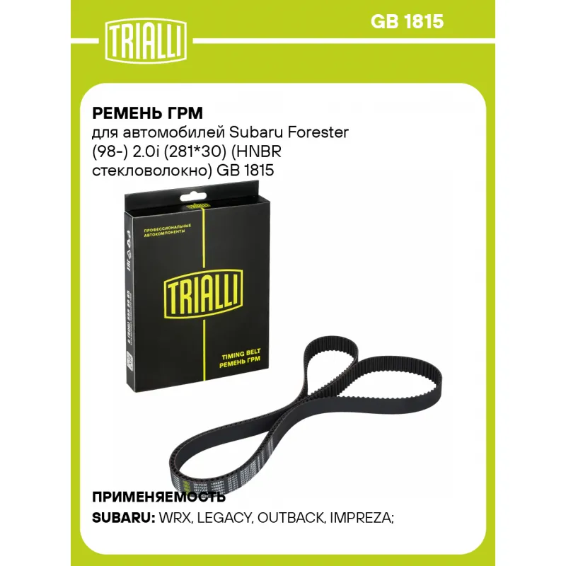 Ремень ГРМ для автомобилей Subaru Forester (98-) 2.0i (281*30) (HNBR стекловолокно) Характеристики: Артикул: GB 1815 OEM номера: 13028AA240, 13028AA250, 13028-AA200 Материал: HNBR Особенности конструкции:: 281YU30 Ширина, мм: 30 Количество ребер: 281 Длина, мм.: 2248 Гарантийный срок: 2 года/60 000 км. Товарная линейка: BLACK Ко... Читать полностью →