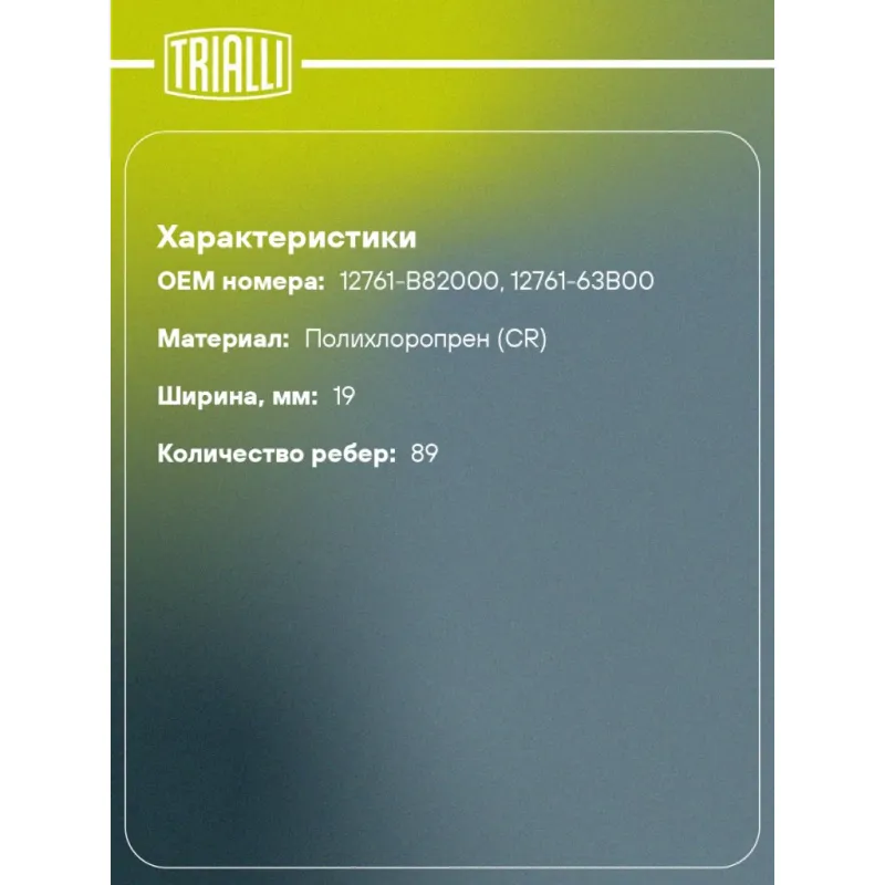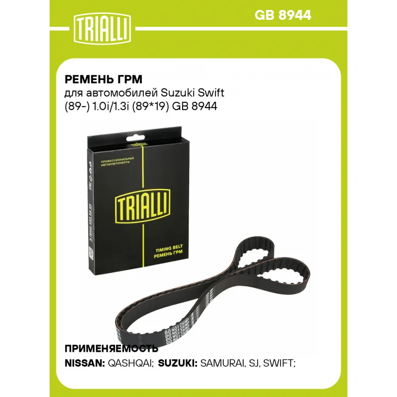 Ремень ГРМ для автомобилей Suzuki Swift (89-) 1.0i/1.3i (89*19) Характеристики: Артикул: GB 8944 OEM номера: 12761-B82000, 12761-63B00 Материал: Полихлоропрен (CR) Особенности конструкции:: 89ZA19 Ширина, мм: 19 Количество ребер: 89 Длина, мм.: 848 Гарантийный срок: 2 года/60 000км. Товарная линейка: BLACK Количество на автомоби... Читать полностью →