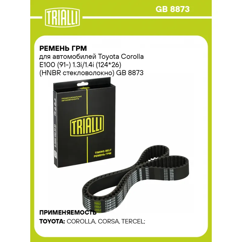 Ремень ГРМ для автомобилей Toyota Corolla E100 (91-) 1.3i/1.4i (124*26) (HNBR стекловолокно) Характеристики: Артикул: GB 8873 OEM номера: 13568-19105, 13568-19106, 13568-YZZ13, 13568-11080 Материал: HNBR Особенности конструкции:: 124MY26 Ширина, мм: 26 Количество ребер: 124 Длина, мм.: 992 Гарантийный срок: 2 года/60 000км. Сопутствующие товары: Ролики: CM 5072, CM 5071 Товарная линейка: BLACK Количество на автомобиль: 1 Комплектация: Ремень ГРМ - 1 шт Гарантия: от 1 года.