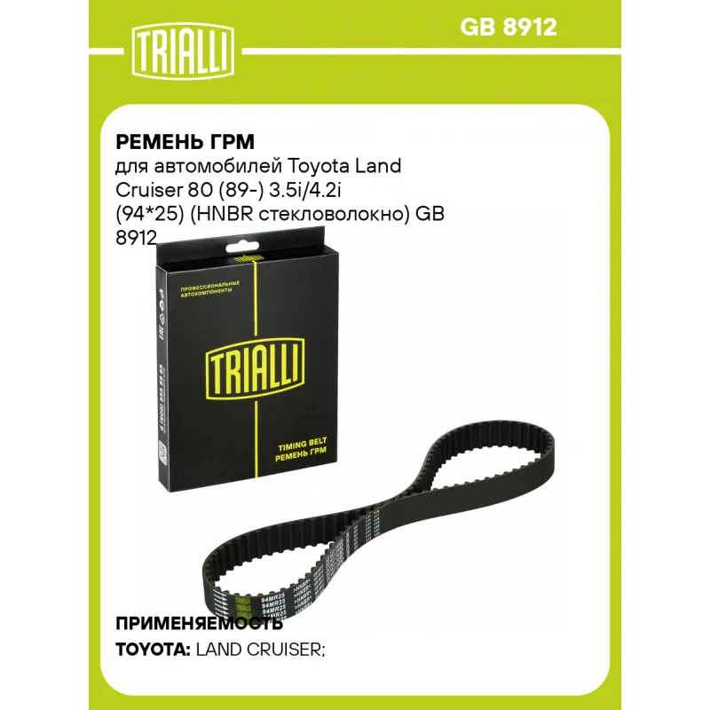 Ремень ГРМ для автомобилей Toyota Land Cruiser 80 (89-) 3.5i/4.2i (94*25) (HNBR стекловолокно) Характеристики: Артикул: GB 8912 OEM номера: 1356819065, 13568-17010 Материал: HNBR Особенности конструкции:: 94MR25 Ширина, мм: 25 Количество ребер: 94 Длина, мм.: 895 Гарантийный срок: 2 года/60 000км. Товарная линейка: BLACK Количес... Читать полностью →