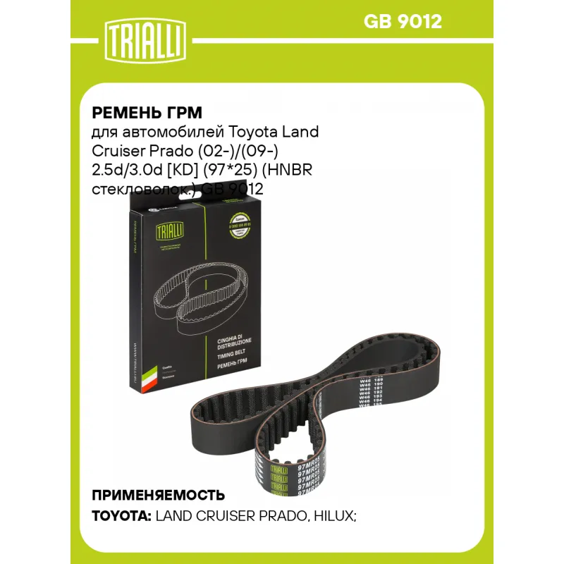 Ремень ГРМ для автомобилей Toyota Land Cruiser Prado (02-)/(09-) 2.5d/3.0d [KD] (97*25) (HNBR стекловолок.) Характеристики: Артикул: GB 9012 OEM номера: 13568-39016, 13568-39015, 13568-39010 Материал: HNBR Особенности конструкции:: 97MR25 Ширина, мм: 25 Количество ребер: 97 Длина, мм.: 924 Гарантийный срок: 2 года/60 000 км. Количество на автомобиль: 1 Товарная линейка: BLACK Комплектация: Ремень ГРМ - 1 шт Гарантия: от 1 года.