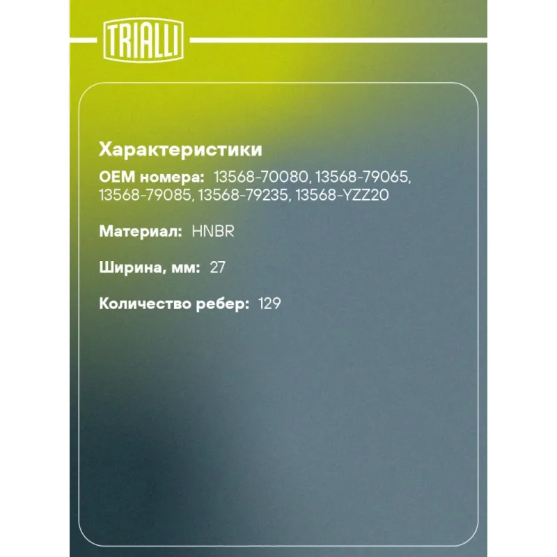 Ремень ГРМ для автомобилей Toyota Mark II X100 (96-) 2.0i (129*27) (HNBR стекловолокно) Характеристики: Артикул: GB 8846 OEM номера: 13568-70080, 13568-79065, 13568-79085, 13568-79235, 13568-YZZ20 Материал: HNBR Особенности конструкции:: 129MY27 Ширина, мм: 27 Количество ребер: 129 Длина, мм.: 1032 Гарантийный срок: 2 года/60 000км. Товарная линейка: BLACK Количество на автомобиль: 1 Комплектация: Ремень ГРМ - 1 шт Гарантия: от 1 года.