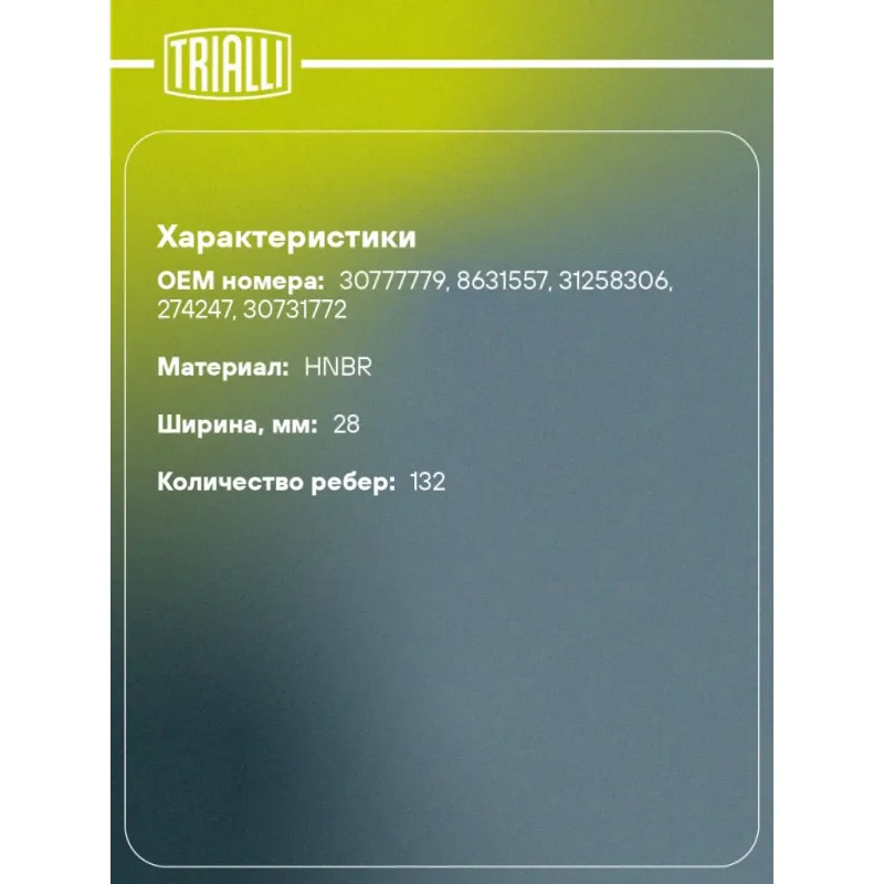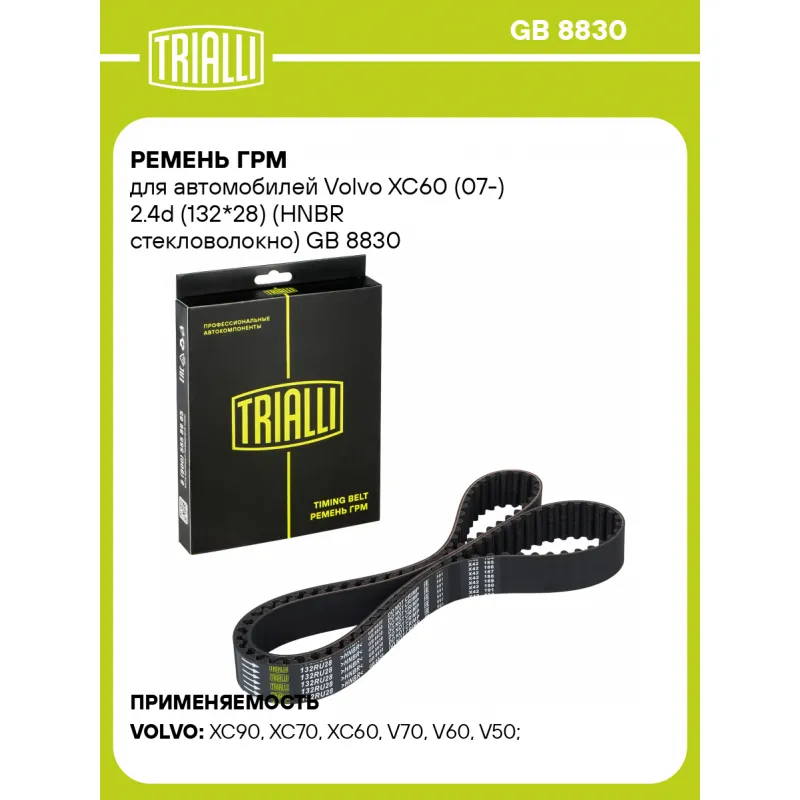 Ремень ГРМ для автомобилей Volvo XC60 (07-) 2.4d (132*28) (HNBR стекловолокно) Характеристики: Артикул: GB 8830 OEM номера: 30777779, 8631557, 31258306, 274247, 30731772 Материал: HNBR Особенности конструкции:: 132RU28 Ширина, мм: 28 Количество ребер: 132 Длина, мм.: 1257 Гарантийный срок: 2 года/60 000 км Товарная линейка: BLAC... Читать полностью →