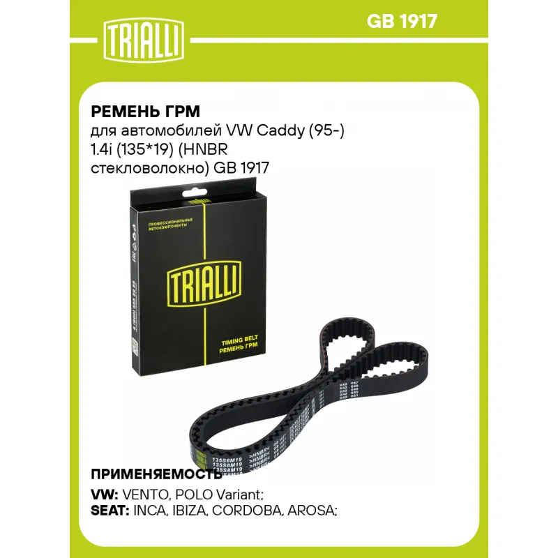 Ремень ГРМ для автомобилей VW Caddy (95-) 1.4i (135*19) (HNBR стекловолокно) Характеристики: Артикул: GB 1917 OEM номера: 030 109 119 AB, 030109119AG, 030109119H, 030109119M, 030109119S Материал: HNBR Особенности конструкции:: 135S8M19 Ширина, мм: 19 Количество ребер: 135 Длина, мм.: 1080 Гарантийный срок: 2 года/60 000 км. Това... Читать полностью →