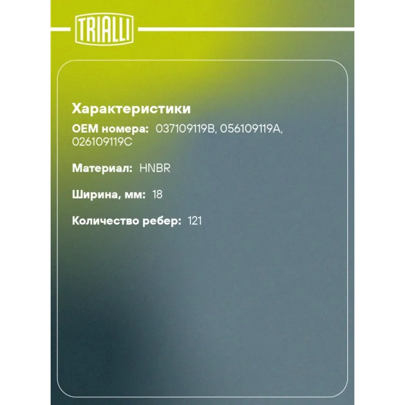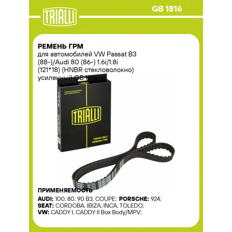 Ремень ГРМ для автомобилей VW Passat B3 (88-)/Audi 80 (86-) 1.6i/1.8i (121*18) (HNBR стекловолокно) усиленный Характеристики: Артикул: GB 1816 OEM номера: 037109119B, 056109119A, 026109119C Материал: HNBR Особенности конструкции:: 121ZA18 Ширина, мм: 18 Количество ребер: 121 Длина, мм.: 1153 Гарантийный срок: 2 года/60 000 км. К... Читать полностью →