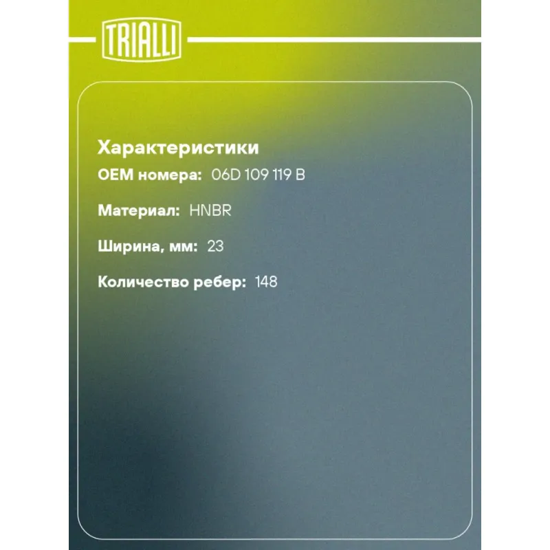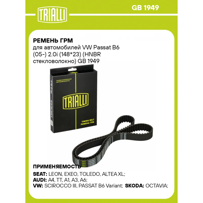 Ремень ГРМ для автомобилей VW Passat B6 (05-) 2.0i (148*23) (HNBR стекловолокно) Характеристики: Артикул: GB 1949 OEM номера: 06D 109 119 B Материал: HNBR Особенности конструкции:: 148S8M23 Ширина, мм: 23 Количество ребер: 148 Длина, мм.: 1184 Гарантийный срок: 2 года/60 000км. Товарная линейка: BLACK Количество на автомобиль: 1... Читать полностью →