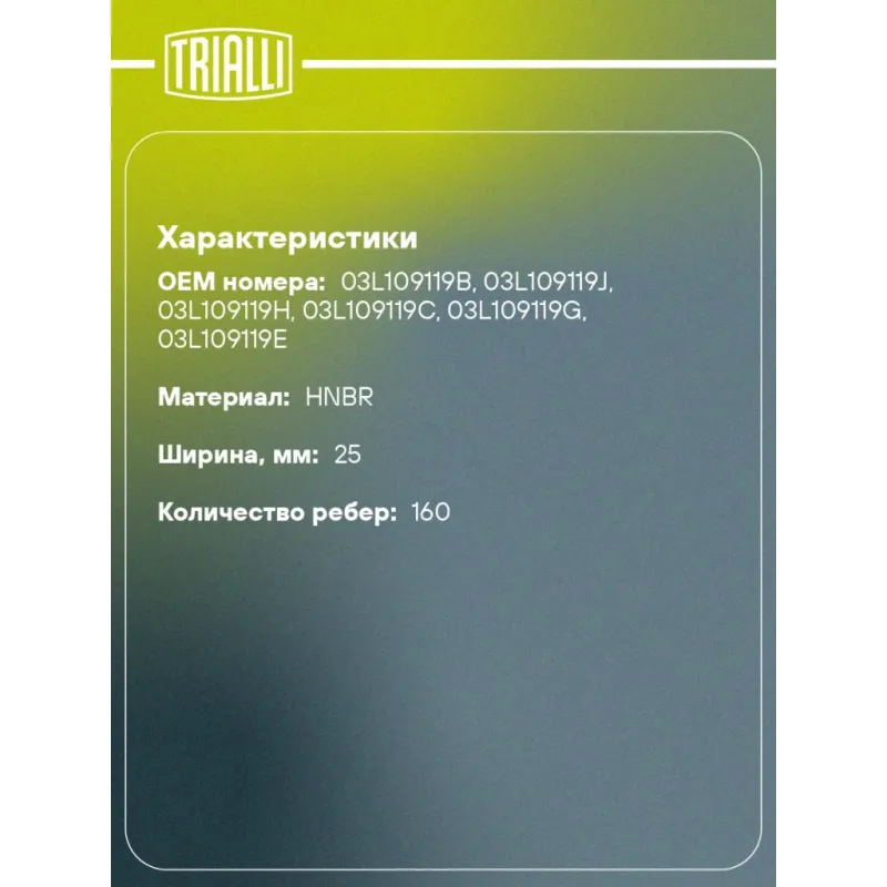 Ремень ГРМ для автомобилей VW Tiguan (078-) 2.0d (160*25) (HNBR стекловолокно) Характеристики: Артикул: GB 8896 OEM номера: 03L109119B, 03L109119J, 03L109119H, 03L109119C, 03L109119G, 03L109119E Материал: HNBR Особенности конструкции:: 160RU25 Ширина, мм: 25 Количество ребер: 160 Длина, мм.: 1524 Гарантийный срок: 2 года/60 000к... Читать полностью →
