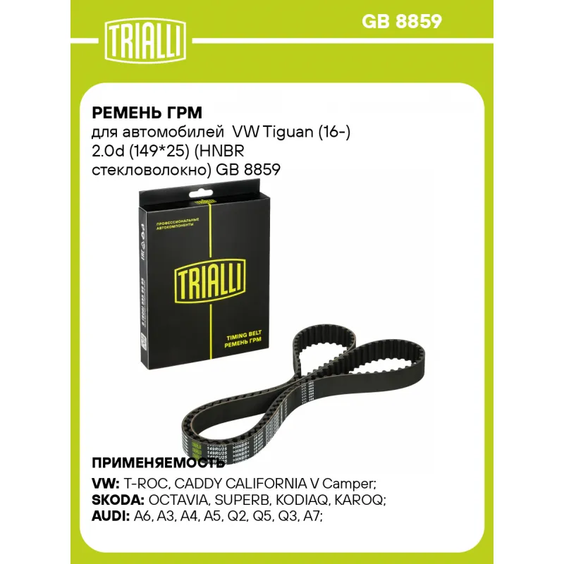 Ремень ГРМ для автомобилей VW Tiguan (16-) 2.0d (149*25) (HNBR стекловолокно) Характеристики: Артикул: GB 8859 OEM номера: 05L 109 119 A, 05L 109 119 B Материал: HNBR Особенности конструкции:: 149RU25 Ширина, мм: 25 Количество ребер: 149 Длина, мм.: 1419 Гарантийный срок: 2 года/60 000км. Товарная линейка: BLACK Количество на а... Читать полностью →
