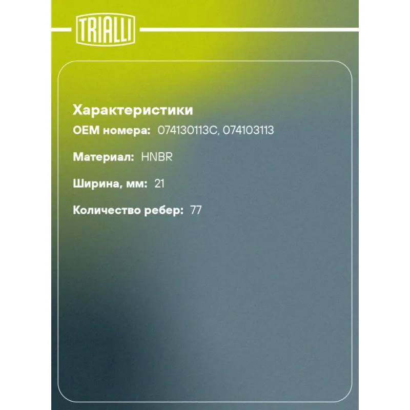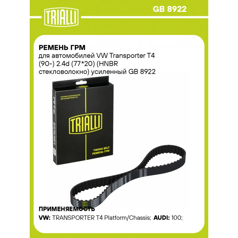 Ремень ГРМ для автомобилей VW Transporter T4 (90-) 2.4d (77*20) (HNBR стекловолокно) усиленный Характеристики: Артикул: GB 8922 OEM номера: 074130113C, 074103113 Материал: HNBR Особенности конструкции:: 77ZBS21 Ширина, мм: 21 Количество ребер: 77 Длина, мм.: 733 Гарантийный срок: 2 года/60 000 км Товарная линейка: BLACK Количест... Читать полностью →