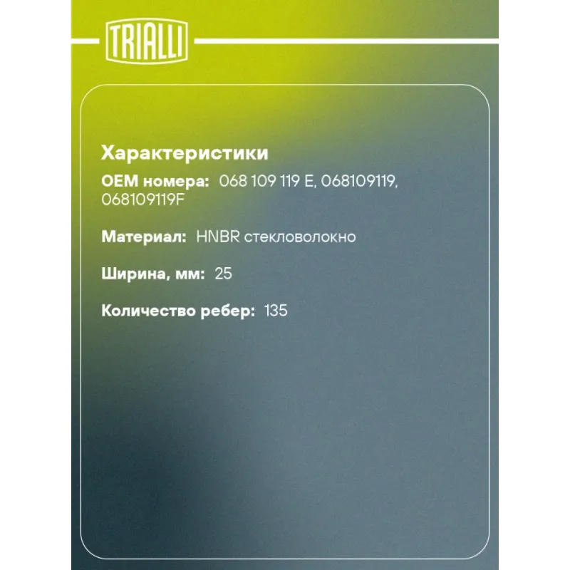 Ремень ГРМ для автомобилей VW Transporter T3 (79-) 1.6d/1.7d (135*25) (HNBR стекловолокно) усиленный Характеристики: Артикул: GB 8862 OEM номера: 068 109 119 E, 068109119, 068109119F Материал: HNBR стекловолокно Особенности конструкции:: 135ZBS25 Ширина, мм: 25 Количество ребер: 135 Длина, мм.: 1286 Гарантийный срок: 2 года / 60 000 км Сопутствующие товары: Ролики: CM 6142, Товарная линейка: BLACK Количество на автомобиль: 1 Комплектация: Ремень ГРМ - 1 шт Гарантия: от 1 года.