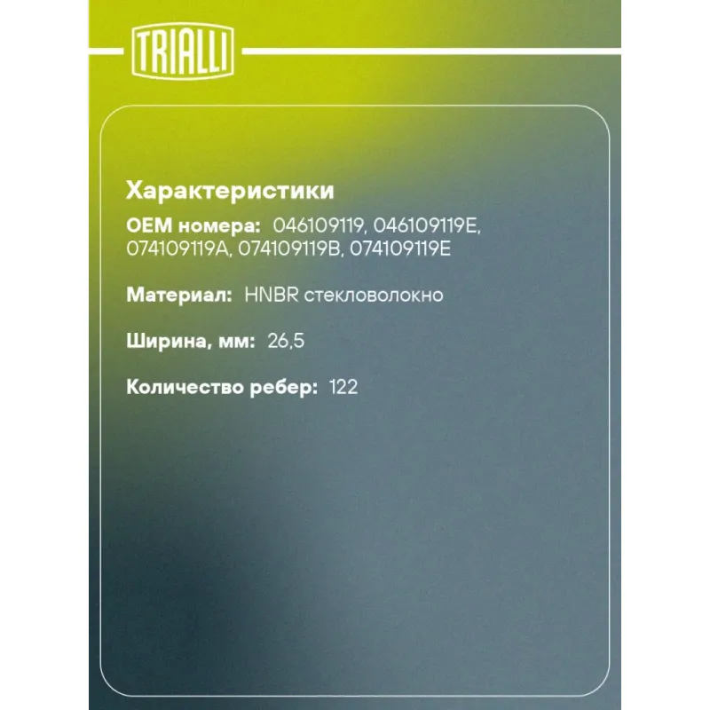 Ремень ГРМ для автомобилей VW Transporter T4 (90-) 2.4D/2.5TDi (122*26,5) (HNBR стекловолокно) Характеристики: Артикул: GB 8894 OEM номера: 046109119, 046109119E, 074109119A, 074109119B, 074109119E Материал: HNBR стекловолокно Особенности конструкции:: 103RU22 Ширина, мм: 26.5 Количество ребер: 122 Длина, мм.: 1162 Гарантийный с... Читать полностью →