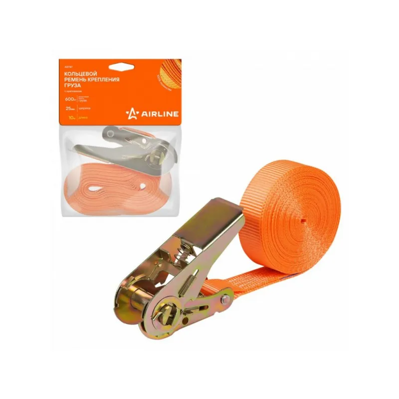 Ремень крепления груза с храповиком, кольцевой 600 кг, 10 м Описание: Кольцевые ремни крепления груза AIRLINE отличаются высокой прочностью и долговечностью благодаря использованию специальных материалов и инновационных технологий. Они оснащены стальным храповым механизмом, который обеспечивает надежную фиксацию груза и предотвращает его смещение при движении и маневрировании. Ремни изготовлены из морозо- и влагостойкой полиэстеровой ленты, которая не стирается со временем и не выгорает на солнце. Благодаря технологии THERMO-FLEX, разработанной компанией AIRLINE - термофиксация самого материала и его дальнейшее растягивание, увеличена прочность и срок службы ремней по сравнению с бюджетными аналогами. Минимальный процент удлинения при максимальной нагрузке (менее 7%) обеспечивает безопасность и надежность при перевозке грузов. Кольцевые стяжные ремни AIRLINE идеально подходят для крепления грузов на грузовых транспортных средствах, прицепах и в багажнике автомобилей, а также для фиксации различных предметов, обеспечивая безопасность и сохранность груза в любых условиях во время различных поездок на рыбалку и туристические поездки. Ремни можно использовать для закрепления снаряжения, такого как палатки, спальные мешки или рюкзаки, крупногабаритный груз и т.д. Важно отметить, что ремень НЕ ПРЕДНАЗНАЧЕН ДЛЯ ПОДЪЕМА грузов. Зажимной ремень - это незаменимый автотовар, который широко используется при перевозке грузов, так как позволяет надежно закрепить груз в грузовых автомобилях, на эвакуаторе. Вас также может заинтересовать ремень стяжной с храповым механизмом и крюками. Утяжка груза. Товар официального производителя AIRLINE. В нашем магазине, вы найдете широкий ассортимент высококачественных автотоваров, автозапчастей, аксессуары для мотоцикла, ремонтные комплекты, аксессуары для машины, электрооборудование, ремни и сетки грузовые и багажные, резинки стяжки и многое другое. Характеристики: Артикул: AST47 Допустимая масса груза, т: 0,6 Длина, м: 10 Ширина ленты, мм: 25 Материал ленты: Полиэстер Фиксатор: Храповой механизм Метариал храпового механизма: Сталь Комплектация: Кольцевой ремень крепления груза - 1 шт Пакет с навершием - 1 шт Гарантия: от 1 года.