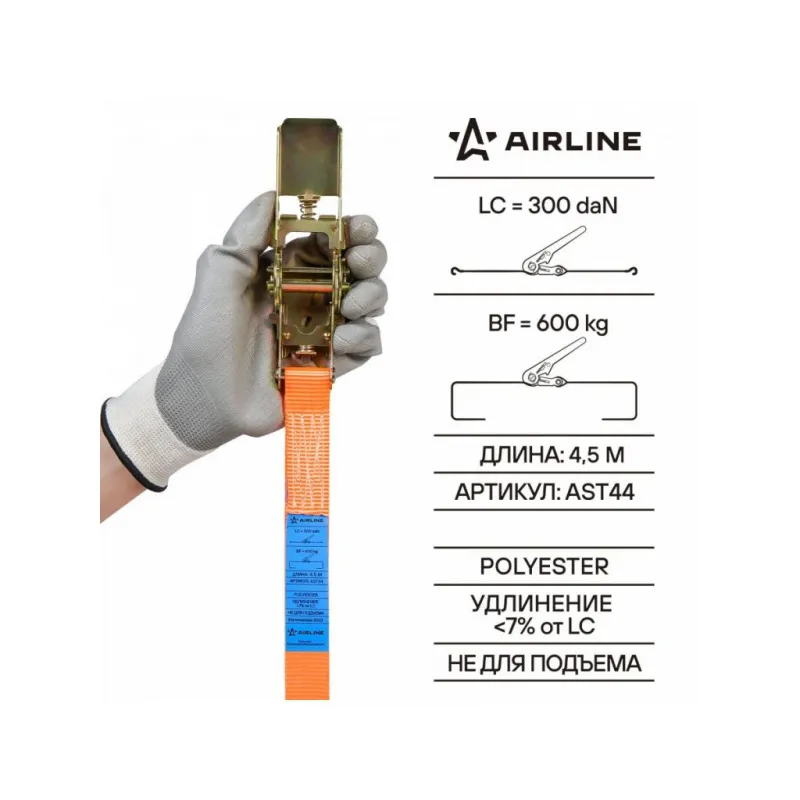 Ремень крепления груза с храповиком, кольцевой 600 кг, 4,5 м Описание: Кольцевые ремни крепления груза AIRLINE отличаются высокой прочностью и долговечностью благодаря использованию специальных материалов и инновационных технологий. Они оснащены стальным храповым механизмом, который обеспечивает надежную фиксацию груза и предотвращает его смещение при движении и маневрировании. Ремни изготовлены из морозо- и влагостойкой полиэстеровой ленты, которая не стирается со временем и не выгорает на солнце. Благодаря технологии THERMO-FLEX, разработанной компанией AIRLINE - термофиксация самого материала и его дальнейшее растягивание, увеличена прочность и срок службы ремней по сравнению с бюджетными аналогами. Минимальный процент удлинения при максимальной нагрузке (менее 7%) обеспечивает безопасность и надежность при перевозке грузов. Кольцевые стяжные ремни AIRLINE идеально подходят для крепления грузов на грузовых транспортных средствах, прицепах и в багажнике автомобилей, а также для фиксации различных предметов, обеспечивая безопасность и сохранность груза в любых условиях во время различных поездок на рыбалку и туристические поездки. Ремни можно использовать для закрепления снаряжения, такого как палатки, спальные мешки или рюкзаки, крупногабаритный груз и т.д. Важно отметить, что ремень НЕ ПРЕДНАЗНАЧЕН ДЛЯ ПОДЪЕМА грузов. Зажимной ремень - это незаменимый автотовар, который широко используется при перевозке грузов, так как позволяет надежно закрепить груз в грузовых автомобилях, на эвакуаторе. Вас также может заинтересовать ремень стяжной с храповым механизмом и крюками. Утяжка груза. Товар официального производителя AIRLINE. В нашем магазине, вы найдете широкий ассортимент высококачественных автотоваров, автозапчастей, аксессуары для мотоцикла, ремонтные комплекты, аксессуары для машины, электрооборудование, ремни и сетки грузовые и багажные, резинки стяжки и многое другое. Характеристики: Артикул: AST44 Допустимая масса груза, т: 0,6 Длина, м: 4,5 Ширина ленты, мм: 25 Материал ленты: Полиэстер Фиксатор: Храповой механизм Метариал храпового механизма: Сталь Комплектация: Кольцевой ремень крепления груза - 1 шт Пакет с навершием - 1 шт Гарантия: от 1 года.