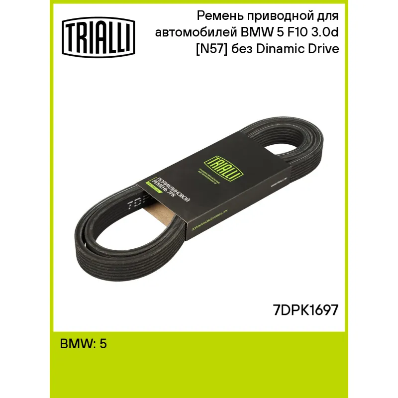 Ремень приводной для автомобилей BMW 5 F10 (10-) 3.0d [N57] без Dinamic Drive Характеристики: Артикул: 7DPK1697 OEM номера: 11287808107, 7808107, 11 28 8 477 788 Материал: EPDM Количество ребер: 7 Длина, мм.: 1697 Товарная линейка: BLACK Количество на автомобиль: 1 Комплектация: Ремень поликлиновой - 1 шт Гарантия: от 1 года.