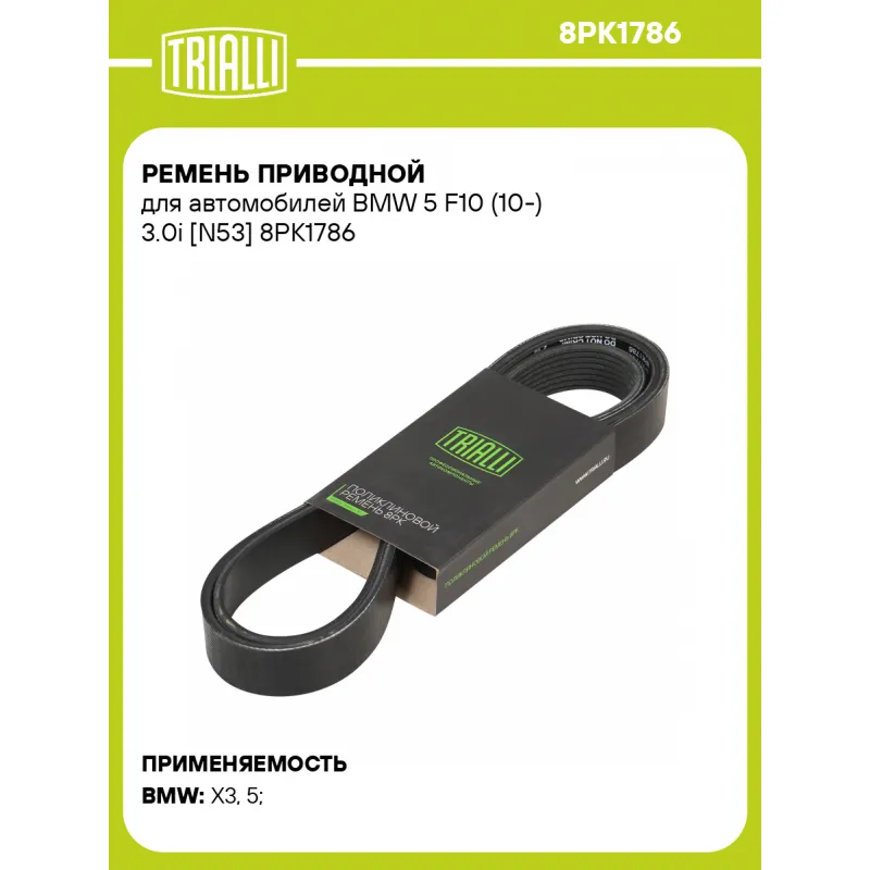 Ремень приводной для автомобилей BMW 5 F10 (10-) 3.0i [N53] Характеристики: Артикул: 8PK1786 OEM номера: 11 28 7 590 148, 11 28 7 628 658 Материал: EPDM Количество ребер: 8 Длина, мм.: 1786 Товарная линейка: BLACK Количество на автомобиль: 1 Комплектация: Ремень поликлиновой - 1 шт Гарантия: от 1 года.