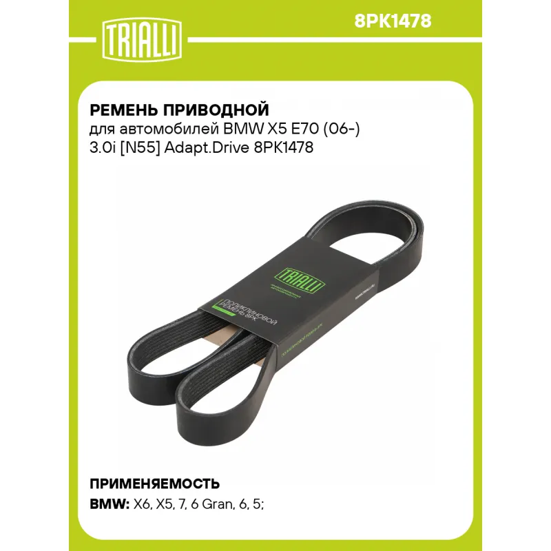 Ремень приводной для автомобилей BMW X5 E70 (06-) 3.0i [N55] Adapt.Drive Характеристики: Артикул: 8PK1478 OEM номера: 11 28 7 589 365, 11 28 7 628 659 Материал: EPDM Количество ребер: 8 Длина, мм.: 1478 Товарная линейка: BLACK Количество на автомобиль: 1 Комплектация: Ремень поликлиновой - 1 шт Гарантия: от 1 года.
