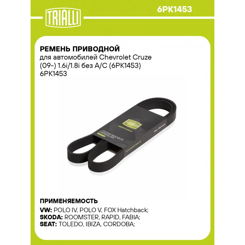 Ремень приводной для автомобилей Chevrolet Cruze (09-) 1.6i/1.8i без A/C (6PK1453) Характеристики: Артикул: 6PK1453 OEM номера: 11287509520, 11287636372, 9633727280, 5750T6, 5750YC, 5750Z1, 1606352480, E117726, 55258359, 1340280, 1340279, 55565302, 96337272, 5750T1, 5750Z0, 03D145933S, 03D145933AG, 55565301, 03D145933, 55580053, 55565304, 55565303, 03D145933AJ Количество на автомобиль: 1 Длина, мм.: 1453 Количество ребер: 6 Материал: EPDM Товарная линейка: BLACK Комплектация: Ремень поликлиновой - 1 шт Гарантия: от 1 года.