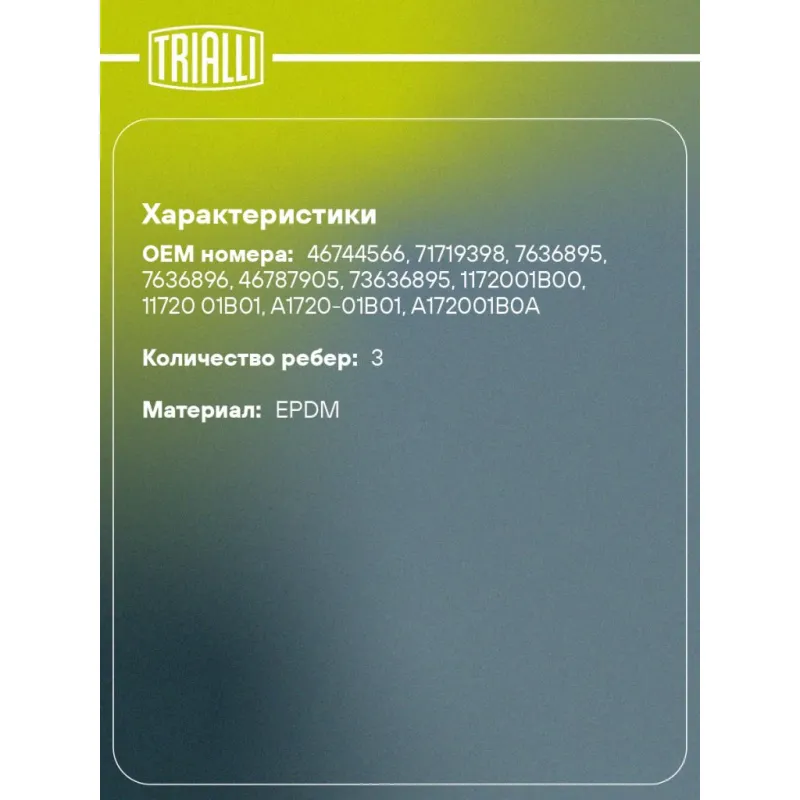 Ремень приводной для автомобилей Fiat Albea (02-)/Doblo (05-) 1.2i/1.4i ГУР (3PK915) Характеристики: Артикул: 3PK915 OEM номера: 46744566, 71719398, 7636895, 7636896, 46787905, 73636895, 1172001B00, 11720 01B01, A1720-01B01, A172001B0A Количество на автомобиль: 1 Длина, мм.: 915 Количество ребер: 3 Материал: EPDM Товарная линейка: BLACK Номера аналоги: 3PK913, 3PK914, 3PK915, 3PK916, 3PK917 Подходит для авто: Fiat Doblo I (01-), Albea (02-), Punto III (05-) Для проверки применяемости отправьте VIN автомобиля через вкладку "Есть вопросы о товаре?" Комплектация: Ремень поликлиновой - 1 шт Гарантия: от 1 года.