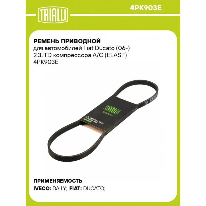 Ремень приводной для автомобилей Fiat Ducato (06-) 2.3JTD компрессора A/C (ELAST) Характеристики: Артикул: 4PK903E OEM номера: 504066407, 5802102136 Материал: EPDM Количество ребер: 4 Длина, мм.: 903 Товарная линейка: BLACK Количество на автомобиль: 1 Комплектация: Ремень поликлиновой ELAST - 1 шт Гарантия: от 1 года.
