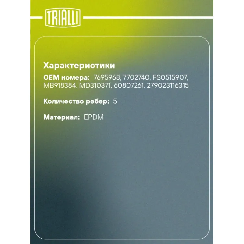 Ремень приводной для автомобилей Fiat Ducato (94-) 1.9d (5PK1040) Характеристики: Артикул: 5PK1040 OEM номера: 7695968, 7702740, FS0515907, MB918384, MD310371, 60807261, 279023116315 Количество на автомобиль: 1 Длина, мм.: 1040 Количество ребер: 5 Материал: EPDM Товарная линейка: BLACK Номера аналоги: 5PK1038, 5PK1039, 5PK1040, 5PK1041, 5PK1042 Подходит для авто: Fiat Ducato II (94-) Peugeot Boxer (94-) Citroen Jumper (94-) Для проверки применяемости отправьте VIN автомобиля через вкладку "Есть вопросы о товаре?" Комплектация: Ремень поликлиновой - 1 шт Гарантия: от 1 года.