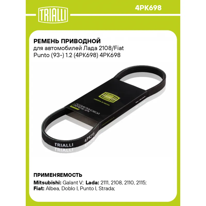 Ремень приводной для автомобилей Лада 2108/Fiat Punto (93-) 1.2 (4PK698) Характеристики: Артикул: 4PK698 OEM номера: 91536222, 93501676, 93502487, 5750G8, 5750SQ, 96001122, 46527552, 46517851, 46787904, 71719039, 8941374780, 8741374780, 8971374780, 21082370172081, MD300587, MD189130, MD303523, MD310617, 9350229100, 575055, 20588660 Количество на автомобиль: 1 Длина, мм.: 698 Количество ребер: 4 Материал: EPDM Товарная линейка: BLACK Номера аналоги: 4PK696, 4PK697, 4PK698, 4PK699 Подходит для авто: Mitsubishi Galant V (92-) ВАЗ 2111, 2108, 2110, 2115 Fiat Albea (02-), Doblo I (01-), Punto I (93-), Strada (99-) Для проверки применяемости отправьте VIN автомобиля через вкладку "Есть вопросы о товаре?" Комплектация: Ремень поликлиновой - 1 шт Гарантия: от 1 года.