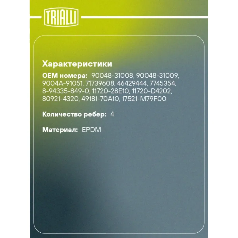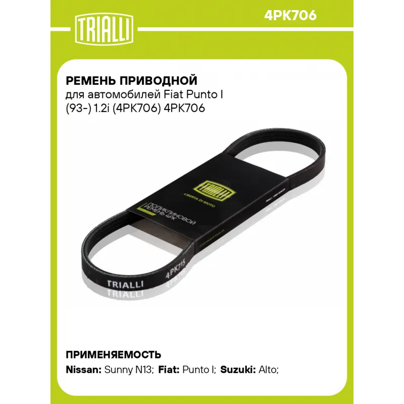 Ремень приводной для автомобилей Fiat Punto I (93-) 1.2i (4PK706) Характеристики: Артикул: 4PK706 OEM номера: 90048-31008, 90048-31009, 9004A-91051, 71739608, 46429444, 7745354, 8-94335-849-0, 11720-28E10, 11720-D4202, 80921-4320, 49181-70A10, 17521-M79F00, 17521-M79F10 Количество на автомобиль: 1 Длина, мм.: 706 Количество ребер: 4 Материал: EPDM Товарная линейка: BLACK Номера аналоги: 4PK704, 4PK705, 4PK706, 4PK707, 4PK708 Подходит для авто: Nissan Sunny N13 (86-) Fiat Punto I (93-) Suzuki Alto (88-) Для проверки применяемости отправьте VIN автомобиля через вкладку "Есть вопросы о товаре?" Комплектация: Ремень поликлиновой - 1 шт Гарантия: от 1 года.