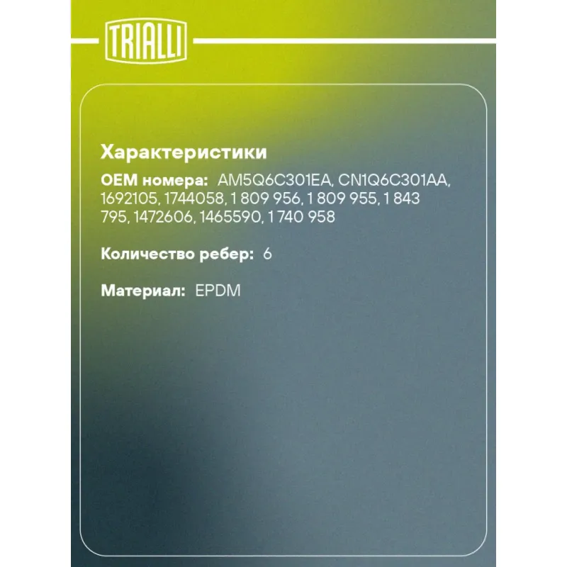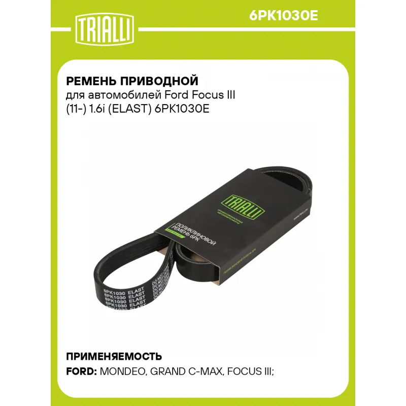 Ремень приводной для автомобилей Ford Focus III (11-) 1.6i (ELAST) Характеристики: Артикул: 6PK1030E OEM номера: AM5Q6C301EA, CN1Q6C301AA, 1692105, 1744058, 1 809 956, 1 809 955, 1 843 795, 1472606, 1465590, 1 740 958 Материал: EPDM Количество ребер: 6 Длина, мм.: 1030 Товарная линейка: BLACK Количество на автомобиль: 1 Комплектация: Ремень поликлиновой ELAST - 1 шт Гарантия: от 1 года.