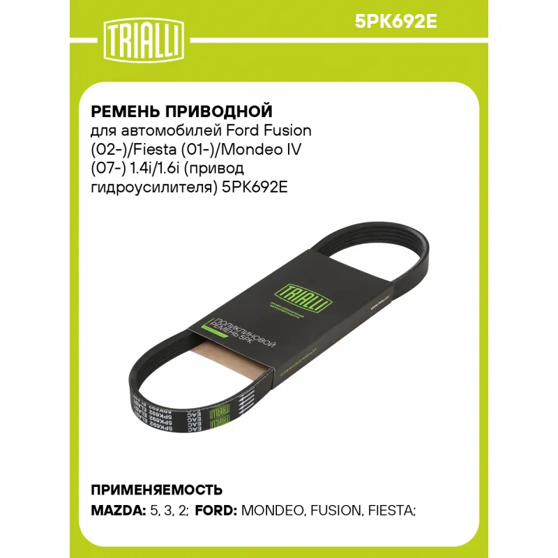 Ремень приводной для автомобилей Ford Fusion (02-)/Fiesta (01-)/Mondeo IV (07-) 1.4i/1.6i (привод гидроусилителя) Характеристики: Артикул: 5PK692E OEM номера: 1143407, 1148907, 1253583, 1365336, 1465590, 2S6E6C301CB, 2S6E6C301DA, 7S7Q6C301BB, 2S6E6D314AC, 2S6E6D314AB, LFY115SAXA, LFY115SAX, LF5015908B, LF50-15-908A, LF50-15-908, C20115909A, C20115909, C201-15-SAX Материал: EPDM Количество ребер: 5 Длина, мм.: 692 Товарная линейка: BLACK Количество на автомобиль: 1 Комплектация: Ремень поликлиновой ELAST - 1 шт Гарантия: от 1 года.