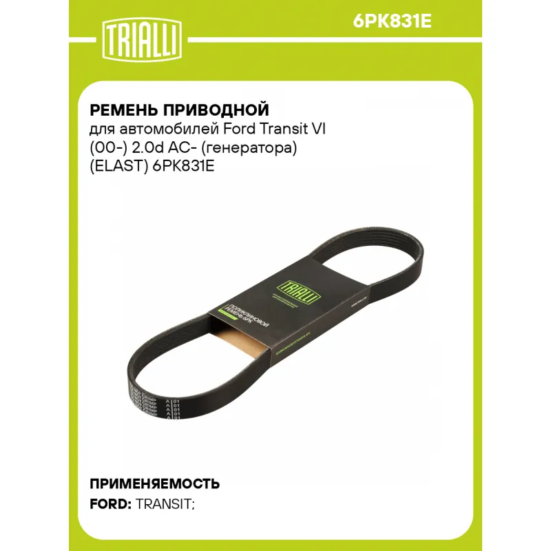 Ремень приводной для автомобилей Ford Transit VI (00-) 2.0d AC- (генератора) (ELAST) Характеристики: Артикул: 6PK831E OEM номера: 1 332 732, 1132641, 1132642, 1332733, 1C1Q-6C301-AB, 1C1Q-6C301-AD, 1C1Q6D314AA, 1C1Q6D314AB, 1C1Q6D314BA, 1C1Q6D314BB Материал: EPDM Количество ребер: 6 Длина, мм.: 831 Товарная линейка: BLACK Количество на автомобиль: 1 Комплектация: Ремень поликлиновой ELAST - 1 шт Гарантия: от 1 года.