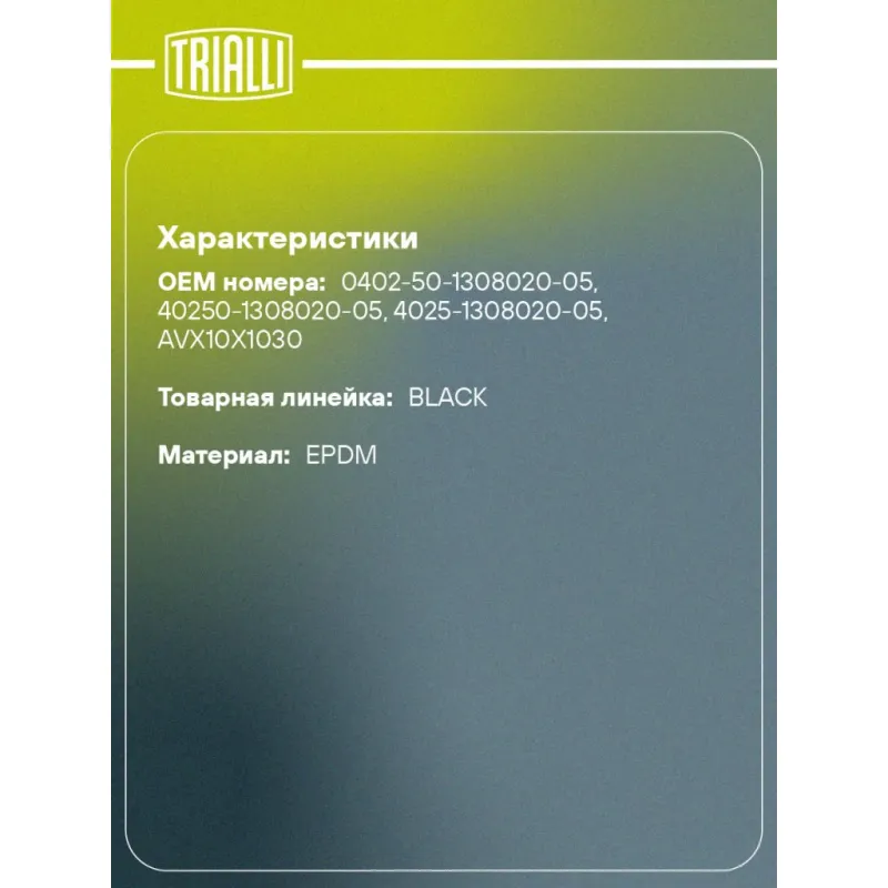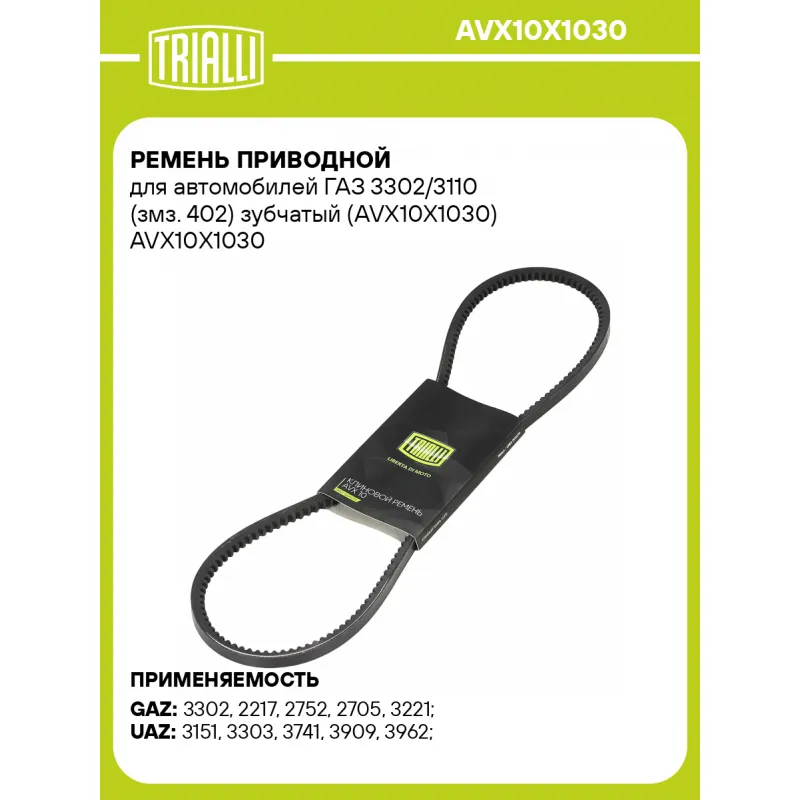 Ремень приводной для автомобилей ГАЗ 3302/3110 (змз. 402) зубчатый (AVX10X1030) Характеристики: Артикул: AVX10X1030 OEM номера: 0402-50-1308020-05, 40250-1308020-05, 4025-1308020-05, AVX10X1030 Гарантийный срок: 2 года/60 000 км. Количество на автомобиль: 1 Длина, мм.: 1030 Материал: EPDM Товарная линейка: BLACK Подходит для авто: ГАЗ 3302, 2217, 2752, 2705, 3221 УАЗ 3151 (85-), 3303, 3741, 3909, 3962 Для проверки применяемости отправьте VIN автомобиля через вкладку "Есть вопросы о товаре?" Комплектация: Ремень клиновой зубчатый - 1 шт Гарантия: от 1 года.