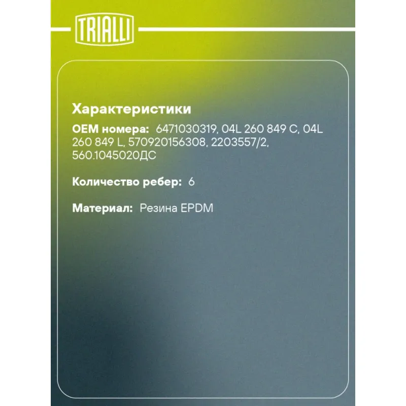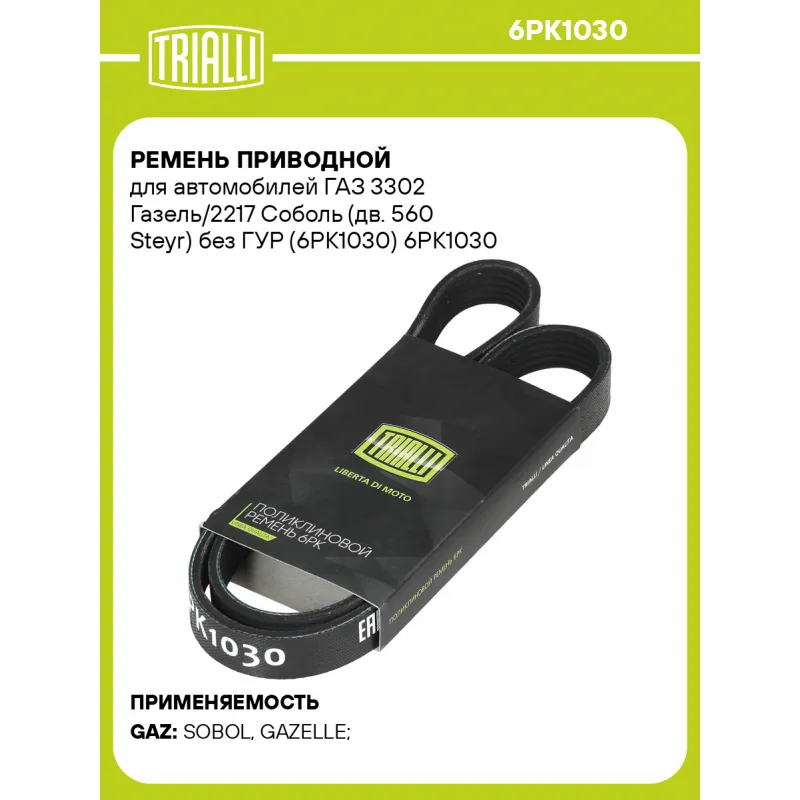 Ремень приводной для автомобилей ГАЗ 3302 Газель/2217 Соболь (дв. 560 Steyr) без ГУР (6PK1030) Характеристики: Артикул: 6PK1030 OEM номера: 6471030319, 04L 260 849 C, 04L 260 849 L, 570920156308, 2203557/2, 560.1045020ДС Количество на автомобиль: 1 Длина, мм.: 1030 Количество ребер: 6 Материал: Резина EPDM Товарная линейка: BLACK Комплектация: Ремень поликлиновой - 1 шт Гарантия: от 1 года.