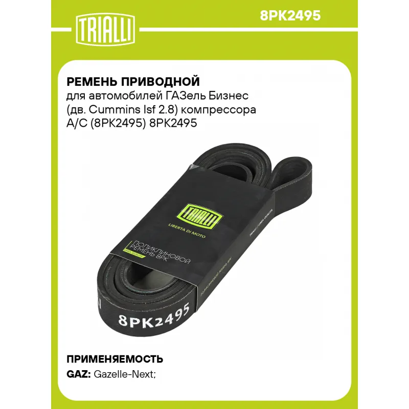 Ремень приводной для автомобилей ГАЗель Бизнес (дв. Cummins Isf 2.8) компрессора A/C (8PK2495) Характеристики: Артикул: 8PK2495 OEM номера: A906 993 24 96, 9069932496, 4933068, 44444933068 Количество на автомобиль: 1 Длина, мм.: 2495 Количество ребер: 8 Материал: Резина EPDM Товарная линейка: BLACK Подходит для авто: ГАЗ Gazelle-Next (13-) Для проверки применяемости отправьте VIN автомобиля через вкладку "Есть вопросы о товаре?" Комплектация: Ремень поликлиновой - 1 шт Гарантия: от 1 года.