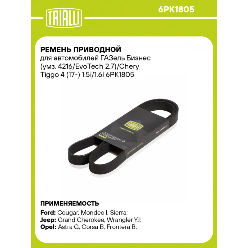 Ремень приводной для автомобилей ГАЗель Бизнес (умз. 4216/EvoTech 2.7)/Chery Tiggo 4 (17-) 1.5i/1.6i Характеристики: Артикул: 6PK1805 OEM номера: 4024820, XS2E-8620NB, 6788619, 6788620, 88WF6C301G1A, 88WF6C301G2A, 110800008AA, 88GB450P710, 1340664, 24452029, 55354682, 6340623, 29452029, 24413293DK, 1340616, 1340627, 1340646, 6340633, 1340626, 8200093814, 5340526, 4575486, 4961058, 91126385, 91151716, 93181711, 024413293DK, 4414599, 53007595, 53010284, 53010285, 53031118, E4T15-1025051AB, 24413293, 90502735, 90510253, 90541338, 9118617, 93181710 Количество на автомобиль: 1 Длина, мм.: 1805 Количество ребер: 6 Материал: EPDM Товарная линейка: BLACK Подходит для авто: Ford Cougar (98-), Mondeo I (93-), Sierra (82-) Jeep Grand Cherokee (92-), Wrangler YJ (86-), Wrangler TJ (96-) Opel Astra G (98-), Corsa B (91-), Frontera B (98-), Signum (02-), Tigra (94-), Vectra C (02-), Zafira A (99-), Vectra B (95-) Для проверки применяемости отправьте VIN автомобиля через вкладку "Есть вопросы о товаре?" Комплектация: Ремень поликлиновой - 1 шт Гарантия: от 1 года.