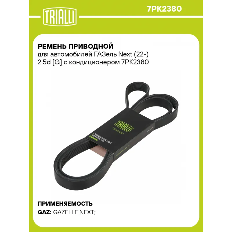 Ремень приводной для автомобилей ГАЗель Next (22-) 2.5d [G] с кондиционером Характеристики: Артикул: 7PK2380 OEM номера: PM 40004241 Материал: EPDM Количество ребер: 7 Длина, мм.: 2380 Гарантийный срок: 2 года/60 000 км. Товарная линейка: BLACK Количество на автомобиль: 1 Комплектация: Ремень поликлиновой - 1 шт Гарантия: от 1 года.