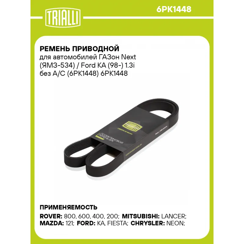 Ремень приводной для автомобилей ГАЗон Next (ЯМЗ-534) / Ford KA (98-) 1.3i без A/C (6PK1448) Характеристики: Артикул: 6PK1448 OEM номера: 1085038, 98KB6C301AA, AHU2749, GFB101448, GMB61448, GRP101448, PQS10035, 4668452, 04668452AB, 4668452AB, 1E03-15-907B, MD340887, MN158795, R524885, 5340.8114170-20 Количество на автомобиль: 1 Длина, мм.: 1448 Количество ребер: 6 Материал: EPDM Товарная линейка: BLACK Комплектация: Ремень поликлиновой - 1 шт Гарантия: от 1 года.