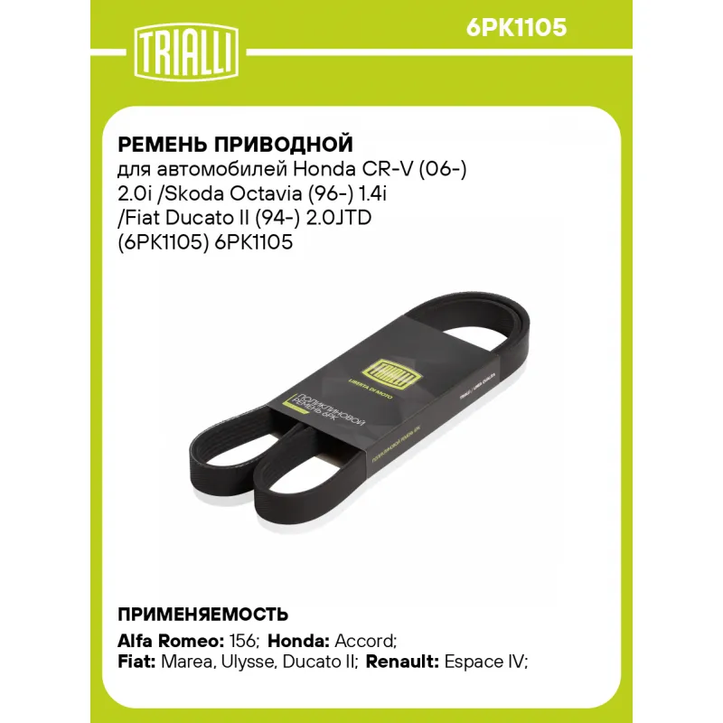 Ремень приводной для автомобилей Honda CR-V (06-) 2.0i /Skoda Octavia (96-) 1.4i /Fiat Ducato II (94-) 2.0JTD (6PK1105) Характеристики: Артикул: 6PK1105 OEM номера: 60813505, 46439000, 91071389, 5750M5, 5750WR, 96235499, 9623549980, 96242338, 9624233880, 71749420, 1558205, 749F8K569ABA, 3019406, 38920-PAA-A01, 38920-PAA-A02, 38920-PDA-E01, 38920-PDA-E03, 217638, 11720-EL05A, 11720-JD20A, 119202Y501, 119208N200, 5750M4, 7701474514, 2146380, 217635, 3020730, 3043652, 3807297 Количество на автомобиль: 1 Длина, мм.: 1105 Количество ребер: 6 Материал: EPDM Товарная линейка: BLACK Подходит для авто: Alfa Romeo 156 (97-) Honda Accord (97-) Fiat Marea (96-), Ulysse (02-), Ducato II (94-) Renault Espace IV (02-) Для проверки применяемости отправьте VIN автомобиля через вкладку "Есть вопросы о товаре?" Комплектация: Ремень поликлиновой - 1 шт Гарантия: от 1 года.