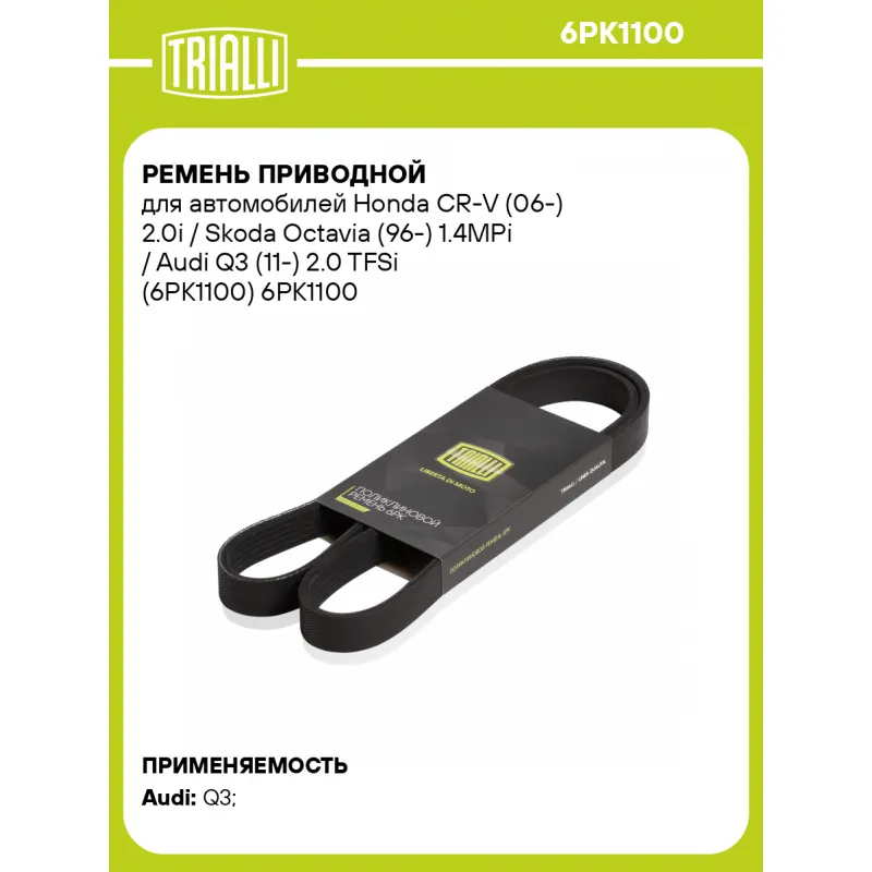 Ремень приводной для автомобилей Honda CR-V (06-) 2.0i / Skoda Octavia (96-) 1.4MPi / Audi Q3 (11-) 2.0 TFSi (6PK1100) Характеристики: Артикул: 6PK1100 OEM номера: 11287841529, 5750M5, 5750WR, 5750E2, 575000, 5750J4, 5750TF, 96152088, 96152089, 9615208980, 38920-PAA-A01, 38920-PAA-A02, 8-97043-866-0, 65.96820-0001, 119202Y501, 1192031U00, 1192031U02, 5750M4, 5750A0, 7700738035, 7701474950, 039903137N, 038903137N, 30145933, 1K0260849, 1K0260849A, 1K0260849B, 06J260849F, 04L 260 849 P, 030 145 933 Количество на автомобиль: 1 Длина, мм.: 1100 Количество ребер: 6 Материал: EPDM Товарная линейка: BLACK Подходит для авто: Audi Q3 (11-) Для проверки применяемости отправьте VIN автомобиля через вкладку "Есть вопросы о товаре?" Комплектация: Ремень поликлиновой - 1 шт Гарантия: от 1 года.