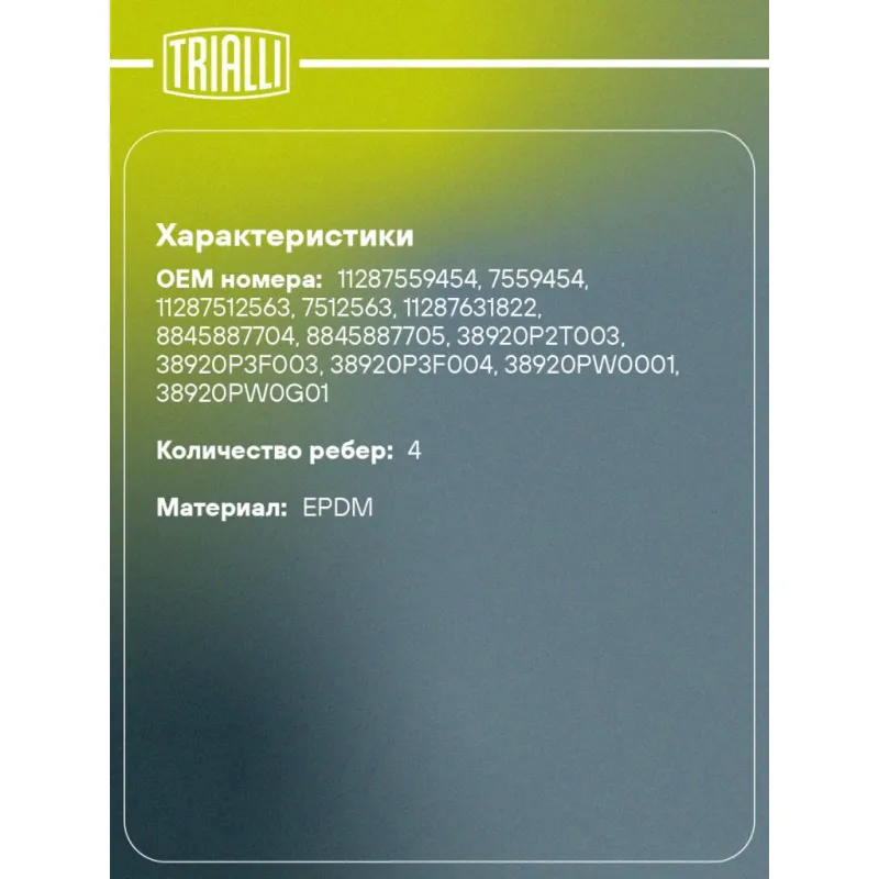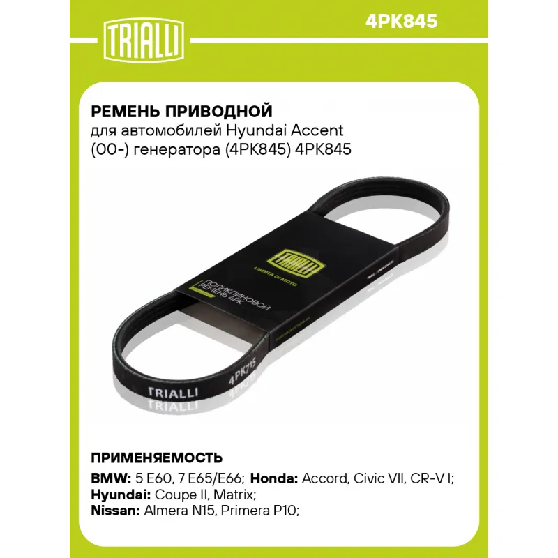 Ремень приводной для автомобилей Hyundai Accent (00-) генератора (4PK845) Характеристики: Артикул: 4PK845 OEM номера: 11287559454, 7559454, 11287512563, 7512563, 11287631822, 8845887704, 8845887705, 38920P2T003, 38920P3F003, 38920P3F004, 38920PW0001, 38920PW0G01, 38920PW0G02, 56992P1JE01, 56992P2A003, 56992P2A004, 5860107930, B3C7-15-907B, 11920V7300, 11920V7301, 11920V7311, 1195053J10, 1195053J20, 1195070J00, 1195070J05, 119509F600, 119509F605, 809214470, 809214550, 809214500, 9091602200, 9091602364, 9936400845, 2521226001, 25212 26000, 25212 26021, 0K2FT15908 Количество на автомобиль: 1 Длина, мм.: 845 Количество ребер: 4 Материал: EPDM Товарная линейка: BLACK Номера аналоги: 4PK844, 4PK845, 4PK846, 4PK847 Подходит для авто: BMW 5 E60 (03-), 5 E60 (03-), 7 E65/E66 (01-), 7 E65/E66 (01-) Honda Accord (97-), Civic VII (00-), CR-V I (95-), HR-V I (98-) Hyundai Coupe II (01-), Matrix (01-), Elantra III (00-), Accent I (94-) Nissan Almera N15 (95-), Primera P10 (90-), Primera P11 (96-), Primera P11 (96-), Sunny N14 (90-) Subaru Legacy B13 (03-), Outback B13 (03-) Для проверки применяемости отправьте VIN автомобиля через вкладку "Есть вопросы о товаре?" Комплектация: Ремень поликлиновой - 1 шт Гарантия: от 1 года.