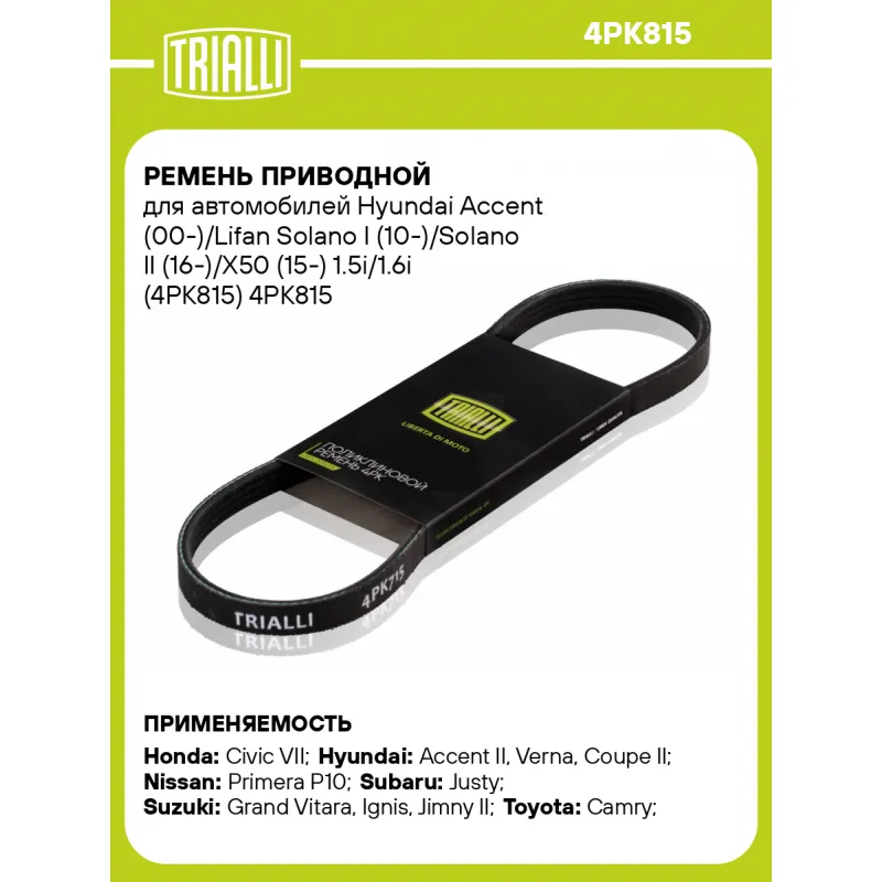 Ремень приводной для автомобилей Hyundai Accent (00-)/Lifan Solano I (10-)/Solano II (16-)/X50 (15-) 1.5i/1.6i (4PK815) Характеристики: Артикул: 4PK815 OEM номера: 5750.G9, 95661735, 96011188, 96117374, 6453.E5, 645300000, 38920P34K01, 56992P02014, 38920P54003, 38920P54004, 38920P73003, 38920P73013, 56992PO2003, 56992PO2004, 38920PP4E01, 38920PP4E02, 56992P02003, 56992P02004, 56992P1KE03, 56992-P76-003, 8943821071, 8970645560, 7750729, F26218381, F26218381A, F26218381X, F80115381A, 1N15-15-909, F8B518381, F8B518381C, 11950-F4300, A192001B10, 11720-71J00, 11720-4007, 11720-71J01, 11720-D4007, 11920-D4007, 119500M200, A1720D4008, 11720D4007TM, 11720-D4008, 11720D4017, 11720Q5201, 11720D4018, 1192001B10, 94382107, 96012051, 1752186500, 1752186520, 1752151A00, 1752160A00, 17521-60A00-000, 17521-60A00-DOM, 17521-78F00, 1752183E00, 9514168L10, 17521-85C00, 17521-85C01, 17521-86510, 49180-40810-B00, 49181-56B10, 95141-68L10-000, 9091602352, 9936502135, 909160233283, 9091602135, 9091602136, 90916-02320, 9091602332, 9936450810, 9936480810, 977131E00, 9771322261AT, 97113-2B000, 977131, 97713 2D000, 97713 22261, 97713-11200, 97713 1C200, 133262, GFB400, GMB103, JPB100045EVA, PQS101010, 1018002703, B21-3701325, LBA8103109 Количество на автомобиль: 1 Длина, мм.: 815 Количество ребер: 4 Материал: EPDM Товарная линейка: BLACK Номера аналоги: 4PK813, 4PK814, 4PK815, 4PK816, 4PK817 Подходит для авто: Honda Civic VII (00-) Hyundai Accent II (99-), Verna (06-), Coupe II (01-), Elantra III (00-), Matrix (01-), Accent I (94-) Nissan Primera P10 (90-) Subaru Justy (03-) Suzuki Grand Vitara (98-), Ignis (03-), Jimny II (98-), Swift (05-), SX4 I (06-), Vitara (96-) Toyota Camry (96-) Kia Cerato I (04-), Rio II (05-), Spectra (00-) Для проверки применяемости отправьте VIN автомобиля через вкладку "Есть вопросы о товаре?" Комплектация: Ремень поликлиновой - 1 шт Гарантия: от 1 года.