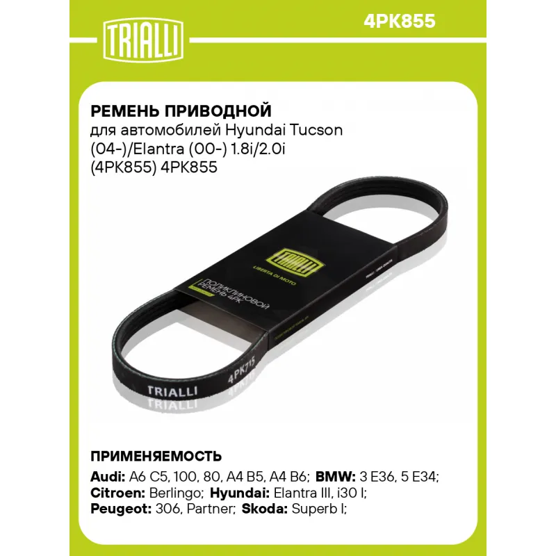 Ремень приводной для автомобилей Hyundai Tucson (04-)/Elantra (00-) 1.8i/2.0i (4PK855) Характеристики: Артикул: 4PK855 OEM номера: 1727378, 64551727378, 128027, 5750Q9, 96019294, 96019295, 96138810, 46451652, 46542303, 7799581, 7743660, B61P15907A, B61P-15-907B, BP4W-15-907B, MD361164, 119509F600, 119509F605, 119509F610, 11720 V7302, 11920-0H600, 11920-0H610, 11920-1E400, 11950-5J001, 11950-5J010, 11950-5J011, AY140-40855, 575080, 73013-PA000, 73323-SA000, 95141-55C10, 977132, 977132D510, 997132, 97713 2D100, 050903137B, 050903137C, 58260849, 058260849A, 028260849G, 06B260849B, 053903137B, 06B260849C, 06B260849D, 06B260849A, STC2326 Количество на автомобиль: 1 Длина, мм.: 855 Количество ребер: 4 Материал: EPDM Товарная линейка: BLACK Номера аналоги: 4PK853, 4PK854, 4PK855, 4PK856, 4PK857 Подходит для авто: Audi A6 C5 (97-), 100 (90-), 80 (91-), A4 B5 (94-), A4 B6 (00-) BMW 3 E36 (90-), 5 E34 (88-) Citroen Berlingo (00-) Hyundai Elantra III (00-), i30 I (07-), Sonata IV (EF) (98-), Accent II (99-), Matrix (01-), Trajet (00-), Tucson I (04-), Accent I (94-) Peugeot 306 (97-), 306 (97-), Partner (96-) Skoda Superb I (01-) Subaru Forester SG (02-), Impreza G10 (92-) Volkswagen Passat B5 (96-) Fiat Albea (02-), Albea (02-), Punto I (93-) Kia Optima (11-), Carens II (06-), Cerato I (04-), Spectra (00-), Sportage II (04-) Для проверки применяемости отправьте VIN автомобиля через вкладку "Есть вопросы о товаре?" Комплектация: Ремень поликлиновой - 1 шт Гарантия: от 1 года.