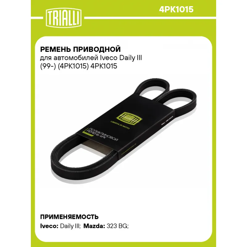Ремень приводной для автомобилей Iveco Daily III (99-) (4PK1015) Характеристики: Артикул: 4PK1015 OEM номера: 4431887401, 44318-87401-000, 7082866, 95TF6C301BA, EJ4K1010, 56992PLM003, 56992PLM004, 1867503300, 500329310, B6S715909A9F, 1U5115904, B58815909, B6S715909, 117200P500, 1172067A00, 11720-67A10, 119201P100, 119201P110, 119505C005, A172067A00, A172067A0M, 5010284916, 7700068151, 1752185300, 17521-85300-000, 982157, 0306GM0051N, 0K20B15909, 12576745 Количество на автомобиль: 1 Длина, мм.: 1015 Количество ребер: 4 Материал: EPDM Товарная линейка: BLACK Подходит для авто: Iveco Daily III (99-) Mazda 323 BG (89-) Для проверки применяемости отправьте VIN автомобиля через вкладку "Есть вопросы о товаре?" Комплектация: Ремень поликлиновой - 1 шт Гарантия: от 1 года.