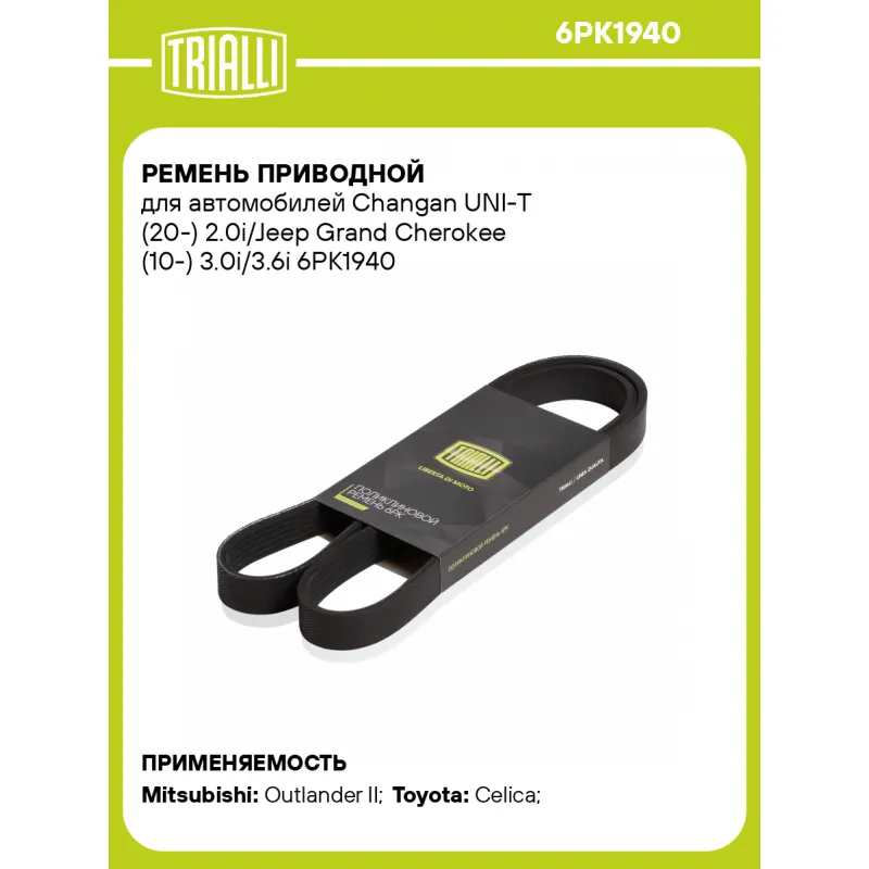 Ремень приводной для автомобилей Changan UNI-T (20-) 2.0i/Jeep Grand Cherokee (10-) 3.0i/3.6i Характеристики: Артикул: 6PK1940 OEM номера: 05184646AC, 5184 646AB, 1036916, 1094675, 1112954, 97KB6C301DA, XS6E6C301JA, XS6E6C301JB, 4451A090, 11720-AR010, 7700734114, R7700734114, T0734114, 90080-91121, 9091602540, 90916-A2007, 99366-J1940, 9091691088, 92067442, 25212-3C300, 25212-3N300, 9091602309, 9091602310, 90916-02371, 5184646AC, LR079263, LR071742, LR071038, D20T011-0500 Количество на автомобиль: 1 Длина, мм.: 1940 Количество ребер: 6 Материал: EPDM Товарная линейка: BLACK Подходит для авто: Mitsubishi Outlander II (06-), Outlander III (12-) Toyota Celica (99-) Для проверки применяемости отправьте VIN автомобиля через вкладку "Есть вопросы о товаре?" Комплектация: Ремень поликлиновой - 1 шт Гарантия: от 1 года.