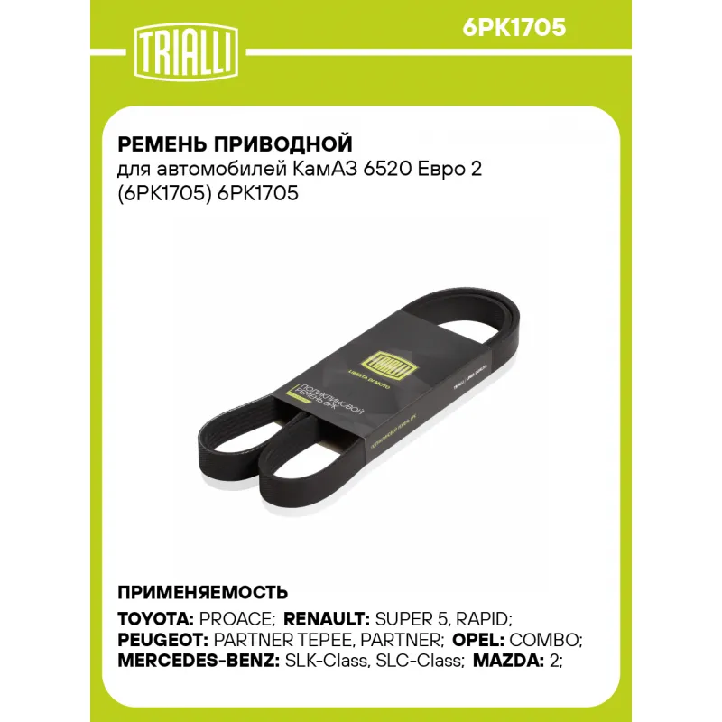 Ремень приводной для автомобилей КамАЗ 6520 Евро 2 (6PK1705) Характеристики: Артикул: 6PK1705 OEM номера: 11281437869, 11287636371, 5750F0, 96155949, 9642383880, 5750EK, 5750KT, 5750LH, 9654114480, 9809996880, 5750VQ, 5750Y5, 5750YA, 5750P2, 5750RR, 5750WP, 5750XR, 96541144, 9641705880, 9634765180, 1141315, 1089877, 2S616C301DA, XS6E6C301BB, Y401-15-908, A0009933900, 9933900, 29931296, 49930796, A0029931296, A0049930796, 0029931296, 0009933900, 0049930796, 11720-4GD0B, 11720-4GD0BCX, 11720-4GD0BEM, 1340037, 55214074, 1340058, 55595073, 575096, 96155951, 5750EV, 5750FY, 5750LG, 5750.RQ, 96423838, 96517648, 9651764880, 96 417 058, 7700722704, SU001-A2684, 25212-37160, 25212-37161, 046 903 137 B, 740.20-1307170, 740.20С-1307170-02 Количество на автомобиль: 1 Длина, мм.: 1705 Количество ребер: 6 Материал: EPDM Товарная линейка: BLACK Комплектация: Ремень поликлиновой - 1 шт Гарантия: от 1 года.