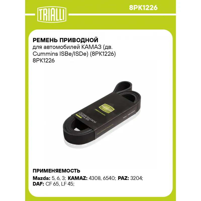 Ремень приводной для автомобилей КАМАЗ (дв. Cummins ISBe/ISDe) (8PK1226) Характеристики: Артикул: 8PK1226 OEM номера: 1702604, AEN576, RS7L15909, RF7L15909, RF5D159099F, RF5D15909, 11720-LA300, 4990977, 4892351, 8PK1226 Количество на автомобиль: 1 Длина, мм.: 1226 Количество ребер: 8 Материал: EPDM Товарная линейка: BLACK Подходит для авто: Mazda 5 (05-), 6 (02-), 3 (03-) КамаАЗ 4308, 6540 ПАЗ 3204 DAF CF 65 (01-), LF 45 (05-) Для проверки применяемости отправьте VIN автомобиля через вкладку "Есть вопросы о товаре?" Комплектация: Ремень поликлиновой - 1 шт Гарантия: от 1 года.