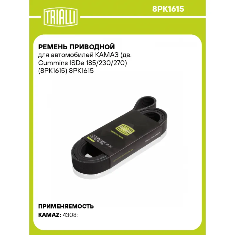 Ремень приводной для автомобилей КАМАЗ (дв. Cummins ISDe 185/230/270) (8PK1615) Характеристики: Артикул: 8PK1615 OEM номера: 0159973292, 0159971192, A0159973292, 159973292, A0159971192, 159971192, 7700068536, 3289001, 8PK1615, 3911566, 3926866, 3975127 Количество на автомобиль: 1 Длина, мм.: 1615 Количество ребер: 8 Материал: EPDM Товарная линейка: BLACK Подходит для авто: КамаАЗ 4308 Для проверки применяемости отправьте VIN автомобиля через вкладку "Есть вопросы о товаре?" Комплектация: Ремень поликлиновой - 1 шт Гарантия: от 1 года.