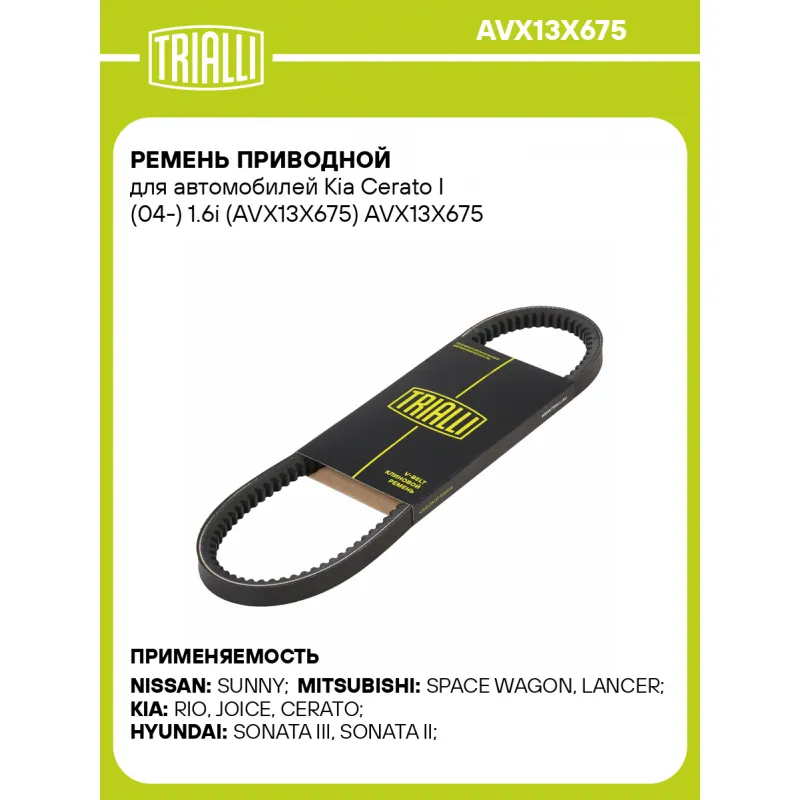 Ремень приводной для автомобилей Kia Cerato I (04-) 1.6i (AVX13X675) Характеристики: Артикул: AVX13X675 OEM номера: AVX13X675, 5723122500, 5723129200, 57170-33900, 57170-33910, 57231-21000, 57231-28400, 57231-28410, MB192977, MB501594, 11950-54A00, 11950-54A10 Длина: 675 Длина, мм.: 675 Гарантийный срок: 2 года/60 000 км. Количе... Читать полностью →